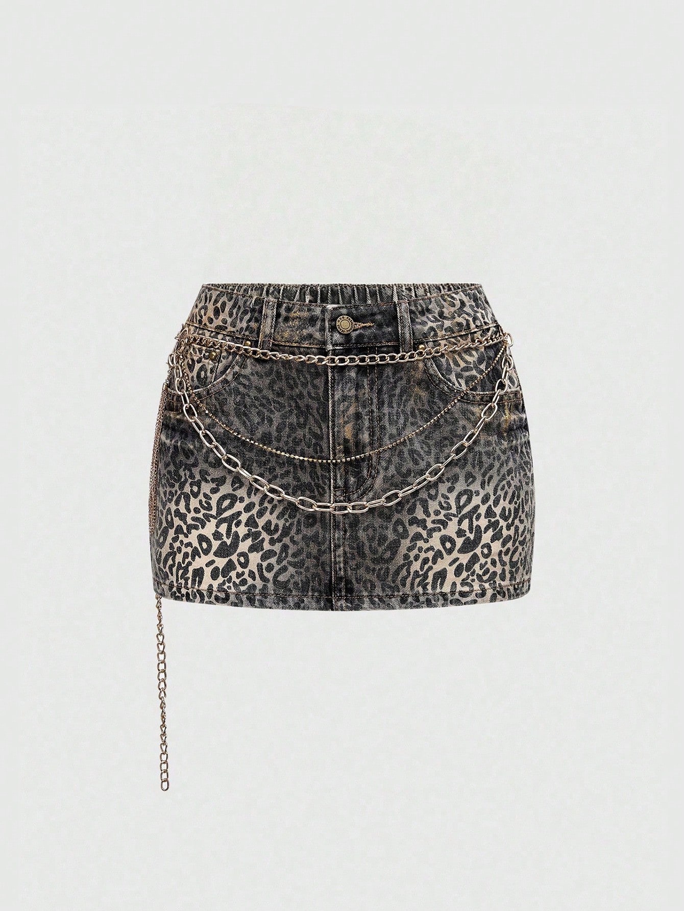 Grunge Punk Spring/Summer PPlus Size Y2K Leopard Print Glitter Rhinestone Chain Decor Super Mini Denim Skirt