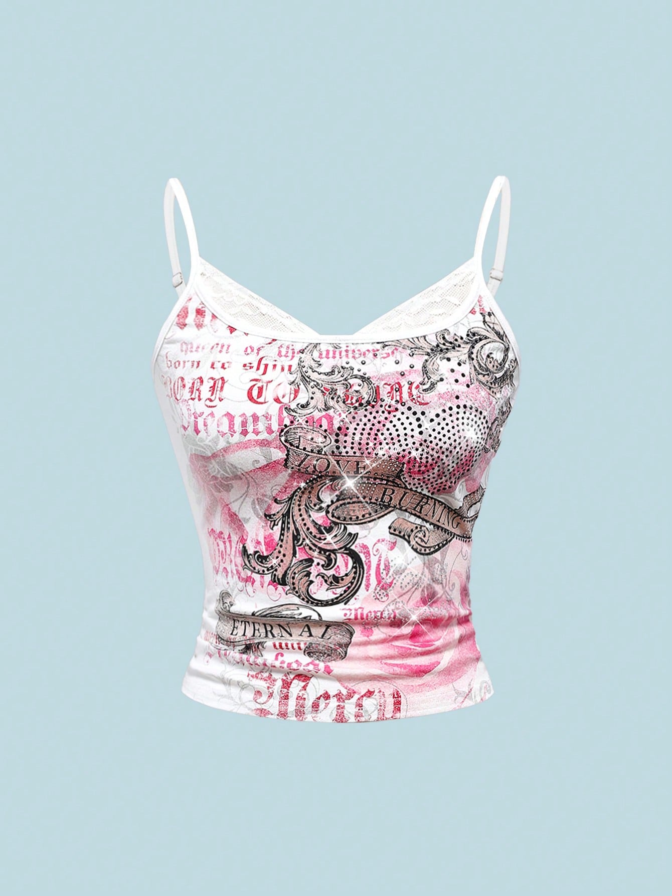 Grunge Punk Spring/Summer Valentine's Day Summer Concert Festival Y2K Chic Retro Romantic Rose Floral & Vine Heart Rhinestone Embellished Crop Top For Women