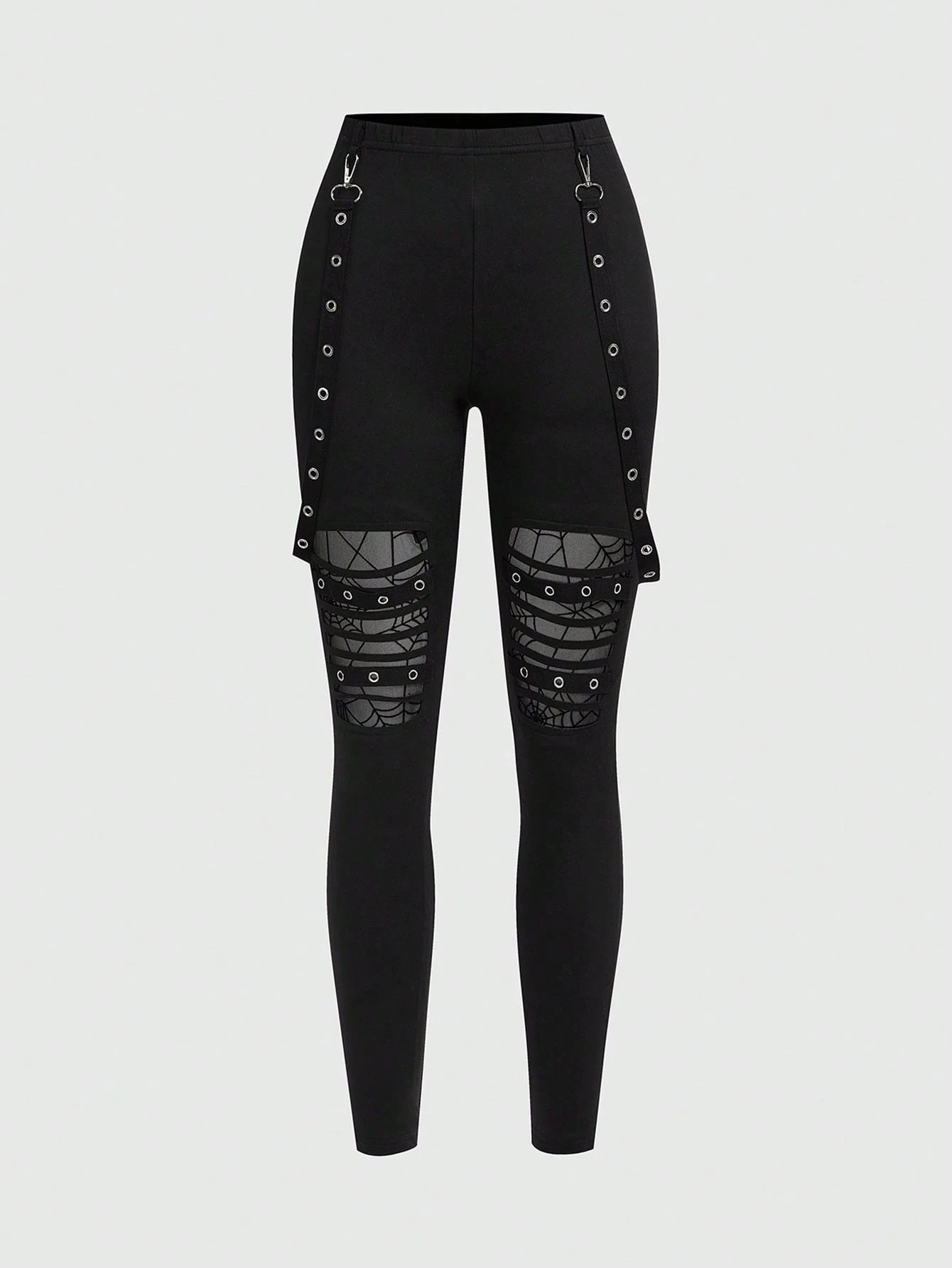 Grunge Punk Spring/SummerblackDark Punk Hollow Out Metal Buckle Decor Skinny Women's Leggings With Detachable Waistband
