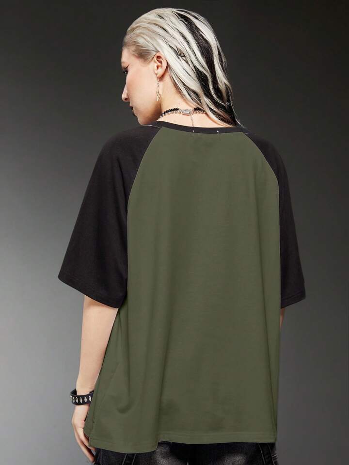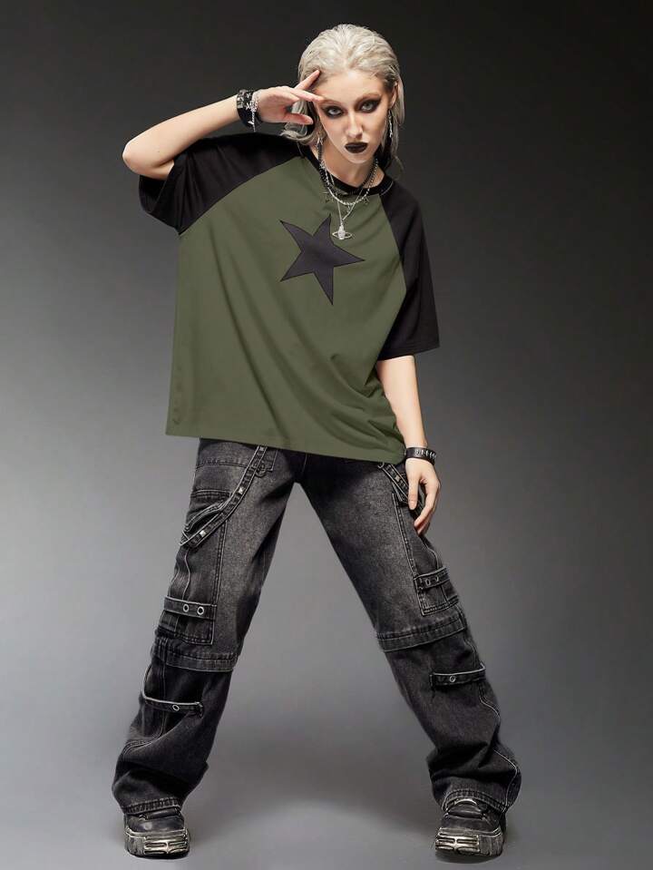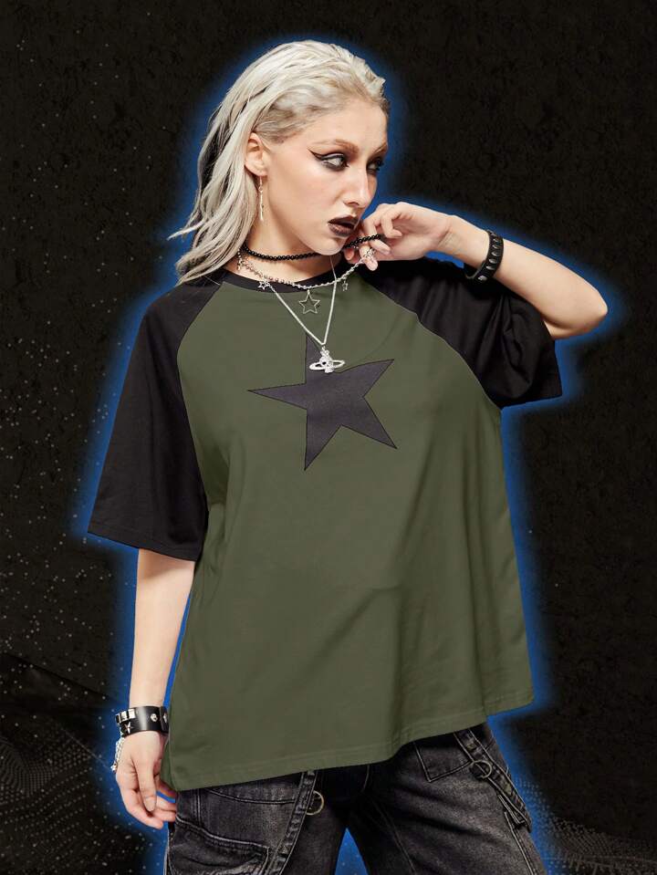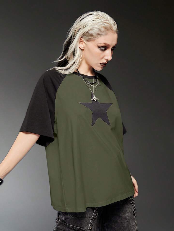 Grunge Punk Star Pattern Contrast Color Round Neck Raglan Sleeve T-shirt