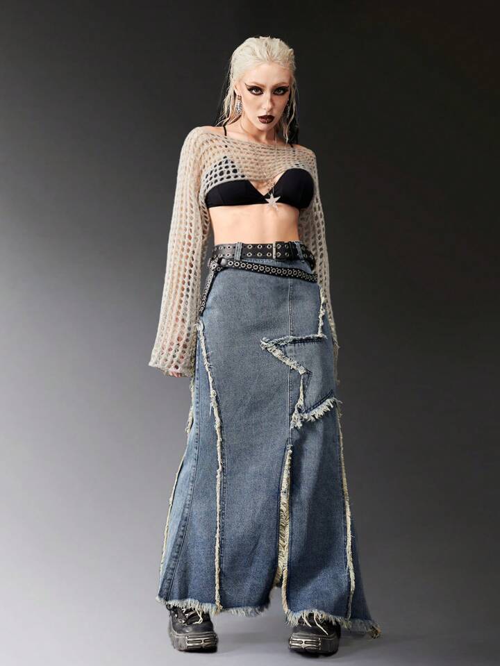 Grunge Punk Star Pattern Raw Trim Split Thigh Denim Skirt