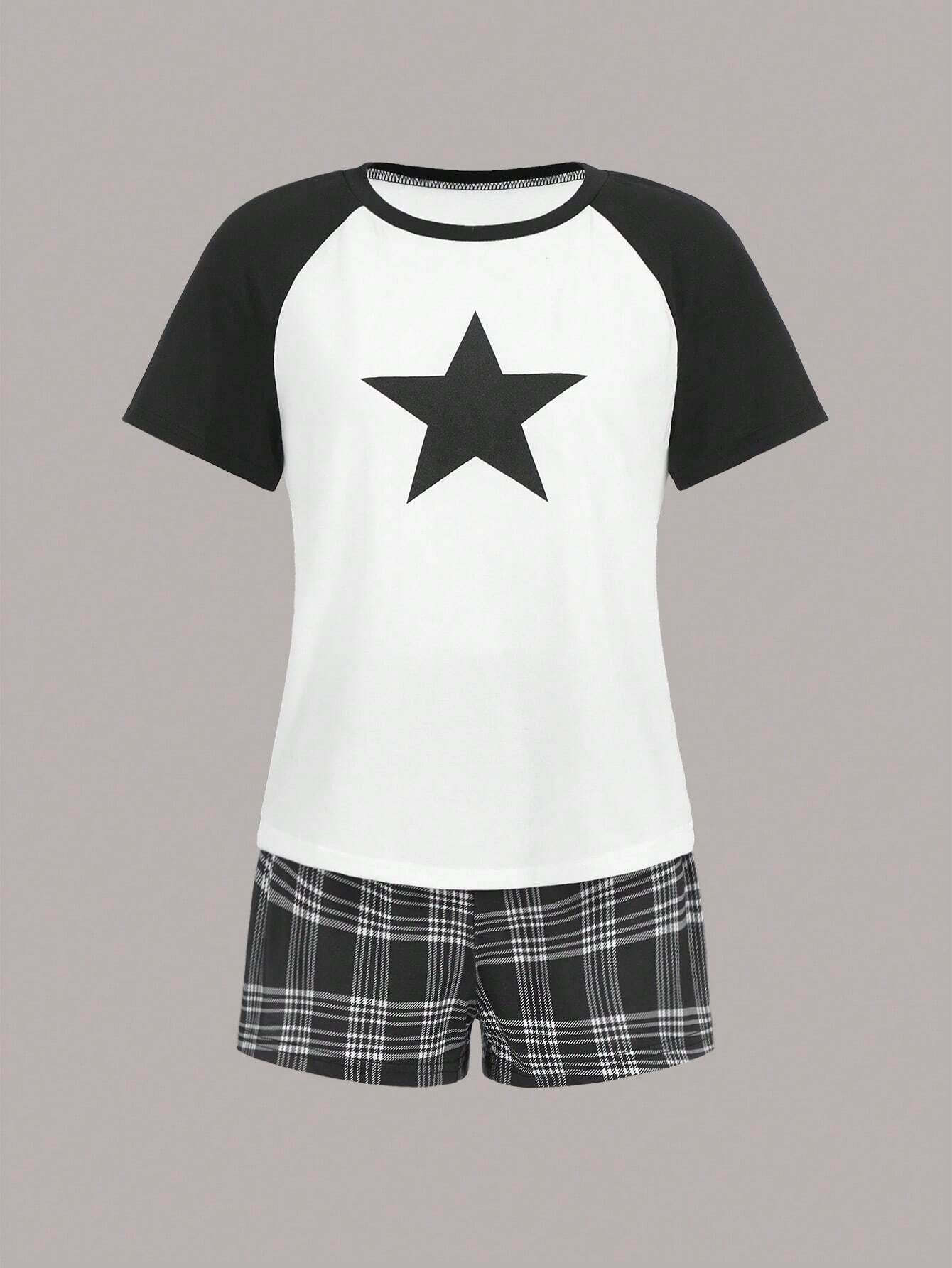 Grunge Punk Star Print Raglan Sleeve Tee & Plaid Shorts PJ Set