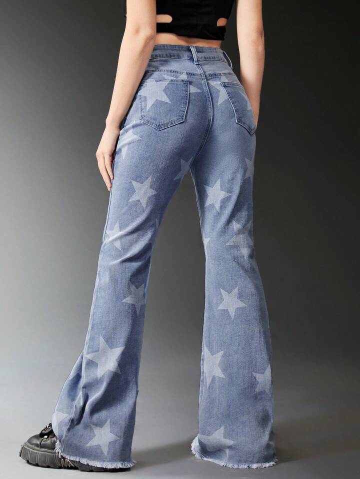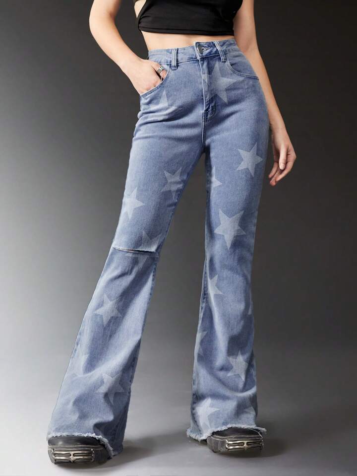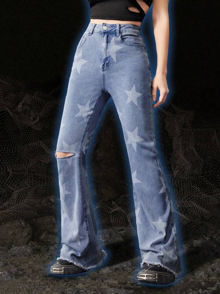 Grunge Punk Star Print Ripped Flare Leg Jeans
