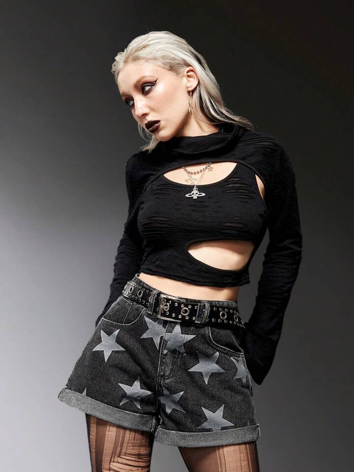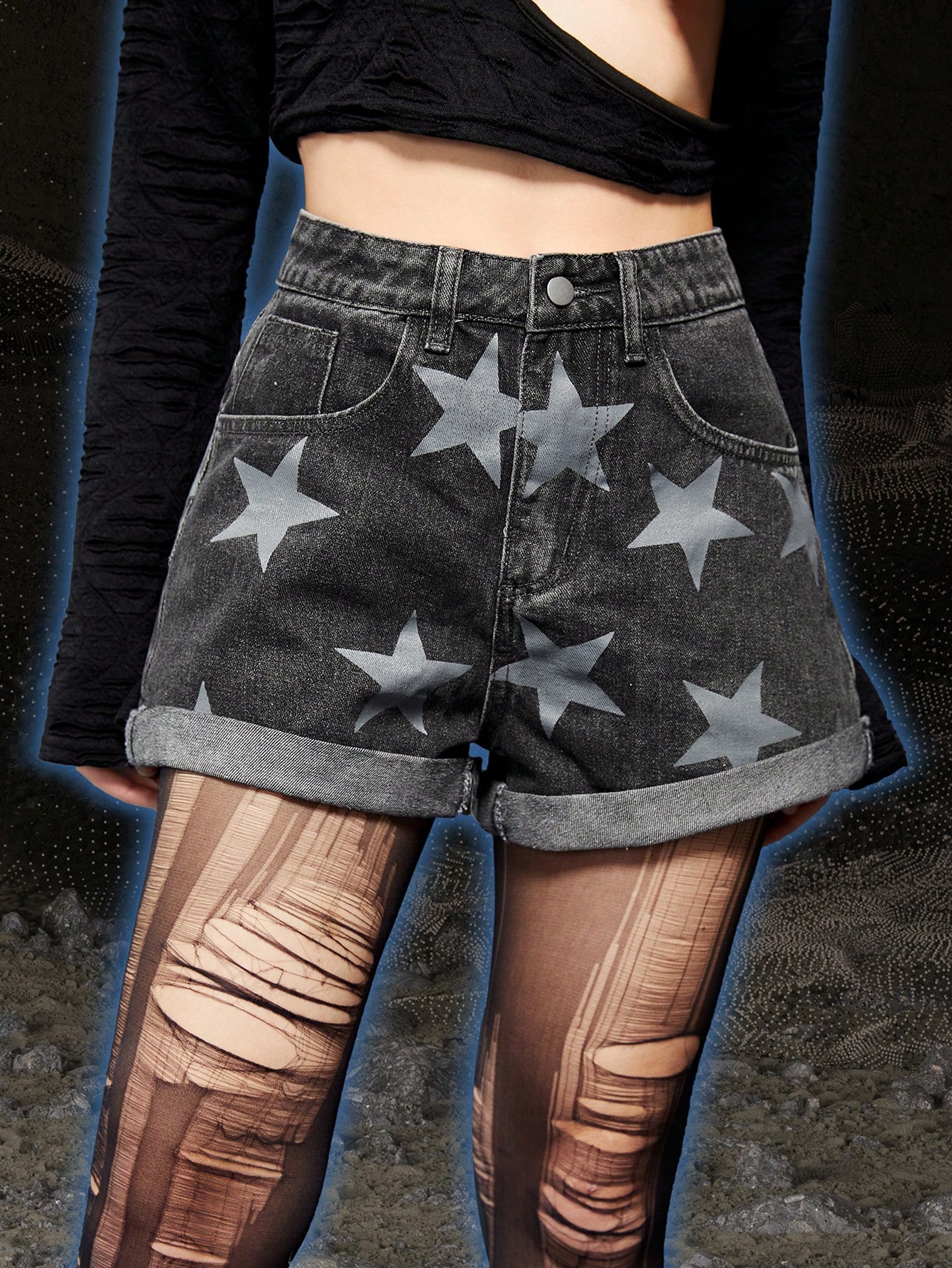 Grunge Punk Star Print Roll Up Hem Denim Shorts