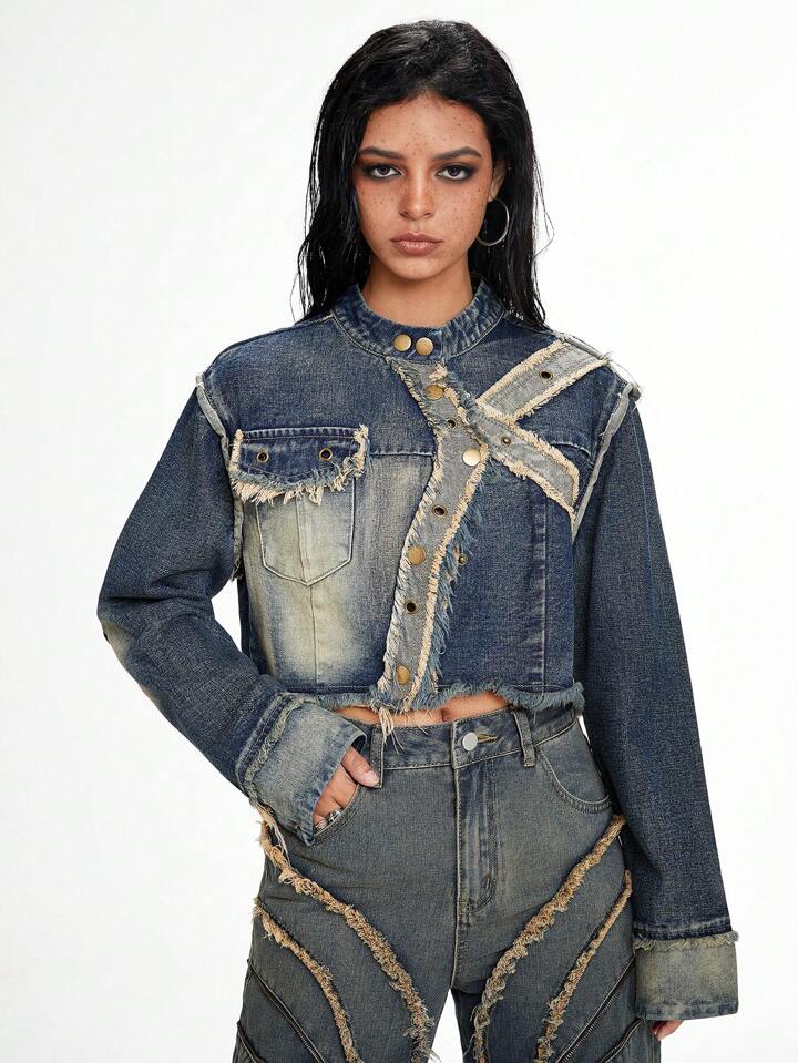 Grunge Punk Street Style Vintage Distressed Patchwork Fringe Loose Short Denim Jacket For Women