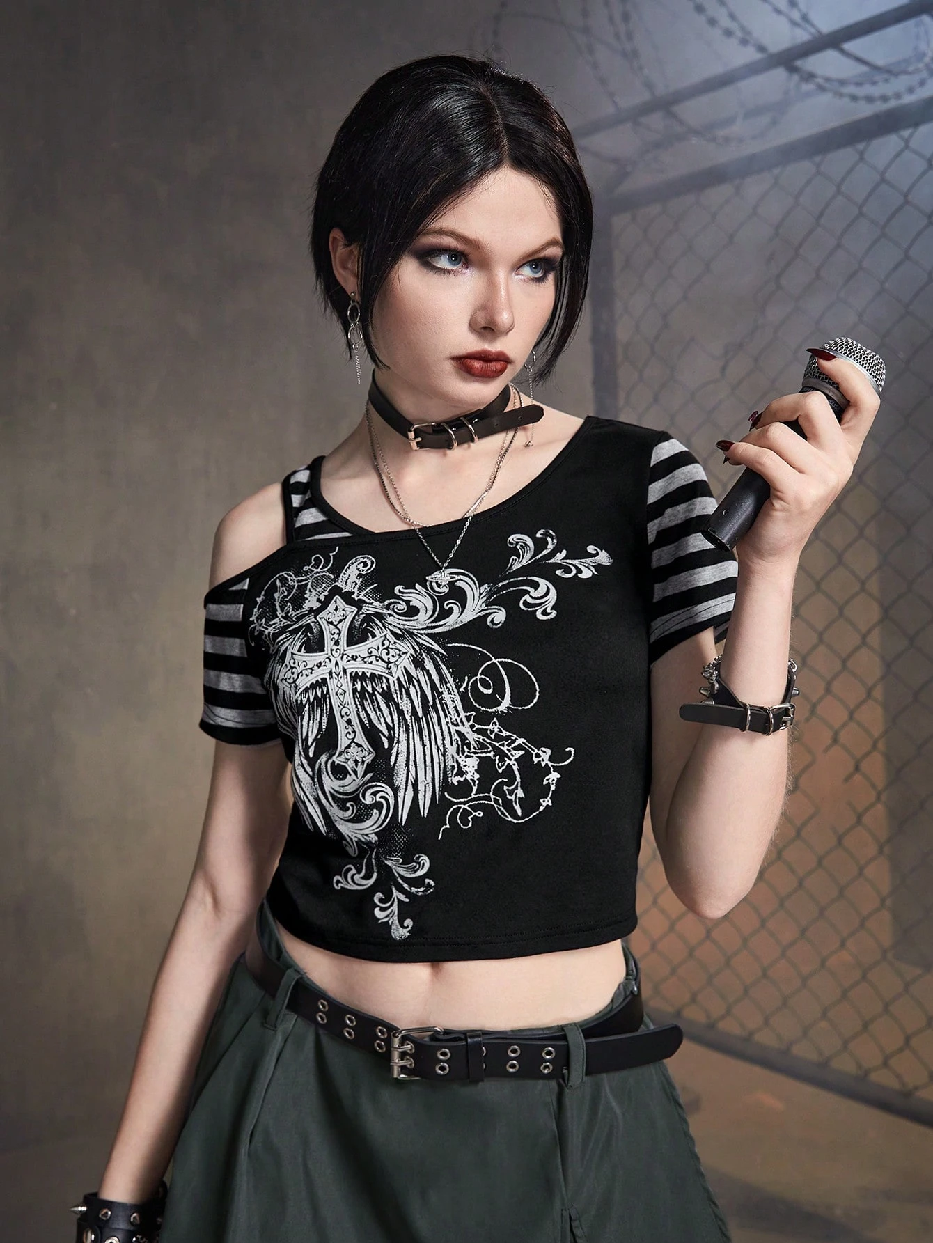 Grunge Punk Striped & Cross Graphic Asymmetrical Neck Tee
