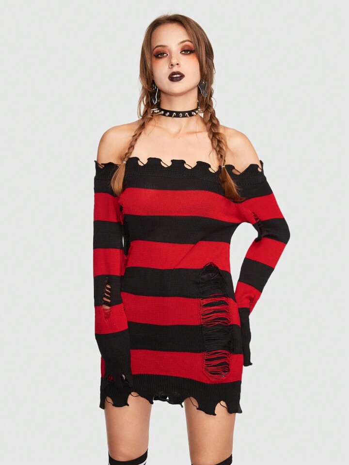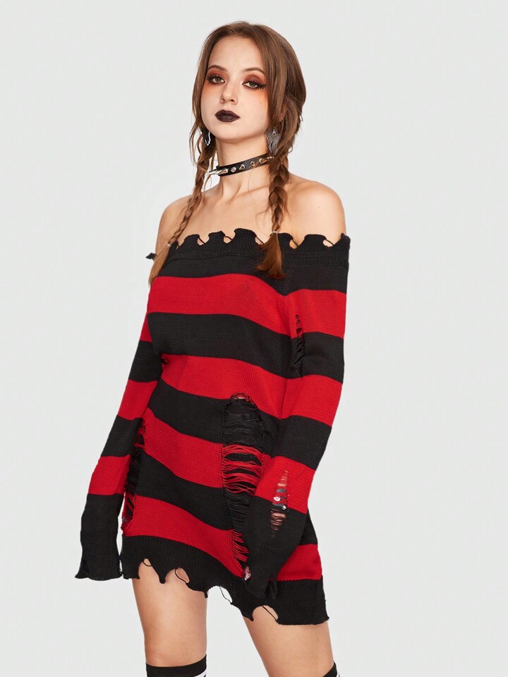 Grunge Punk Striped Off Shoulder Distressed Sweater