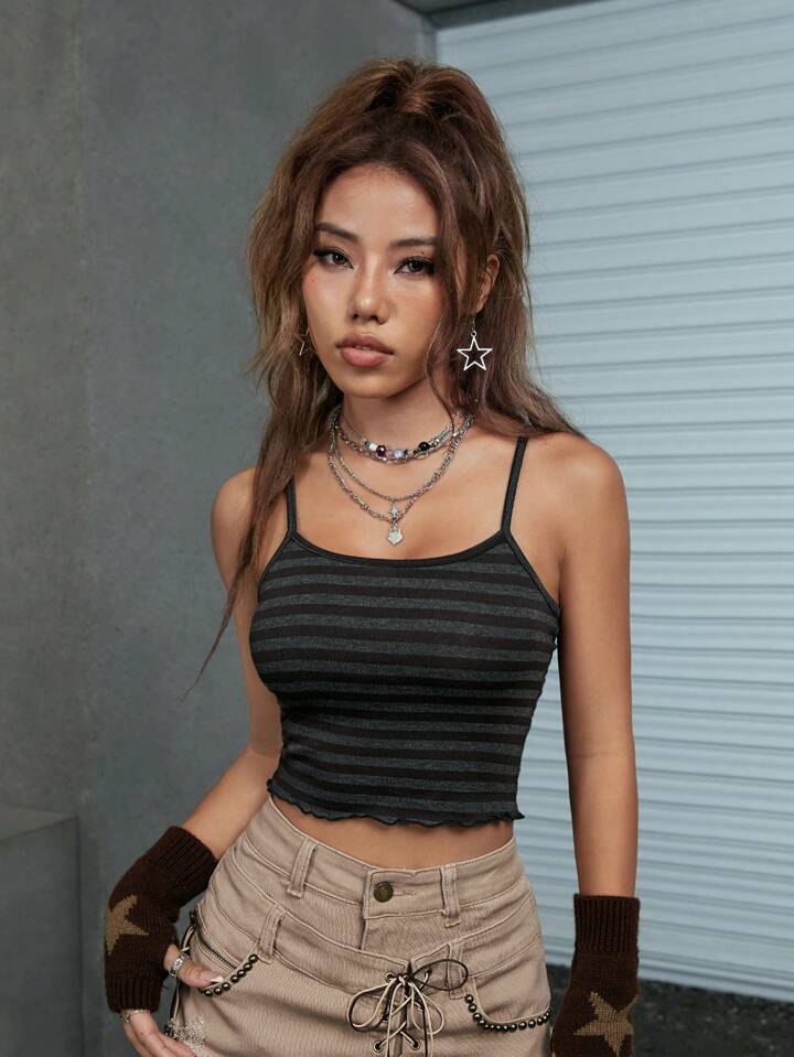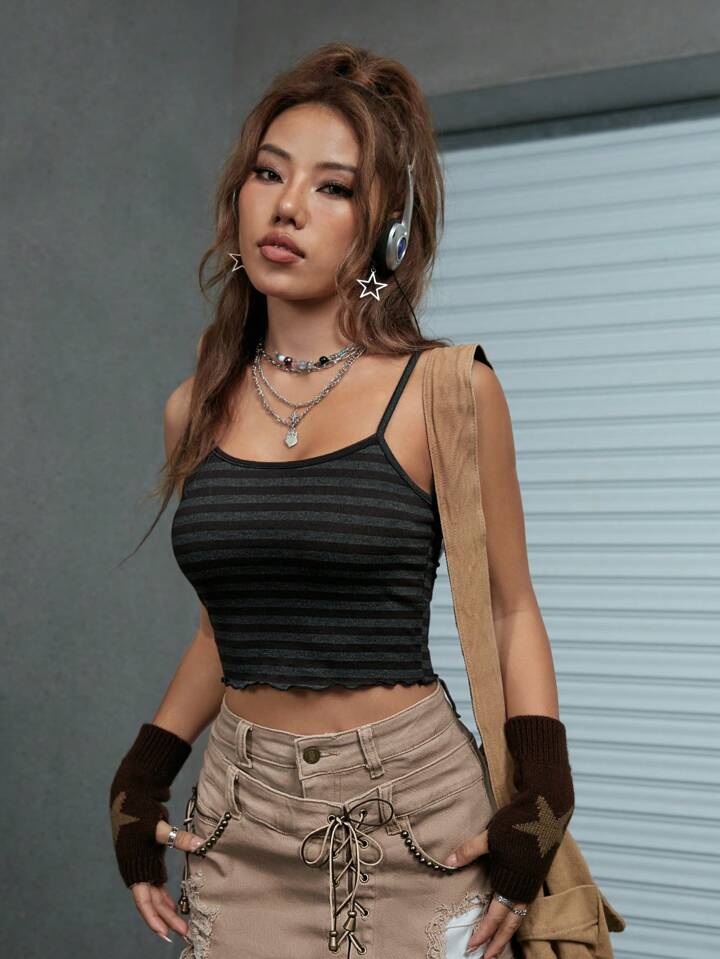 Grunge Punk Striped Print Lettuce Trim Cami Top