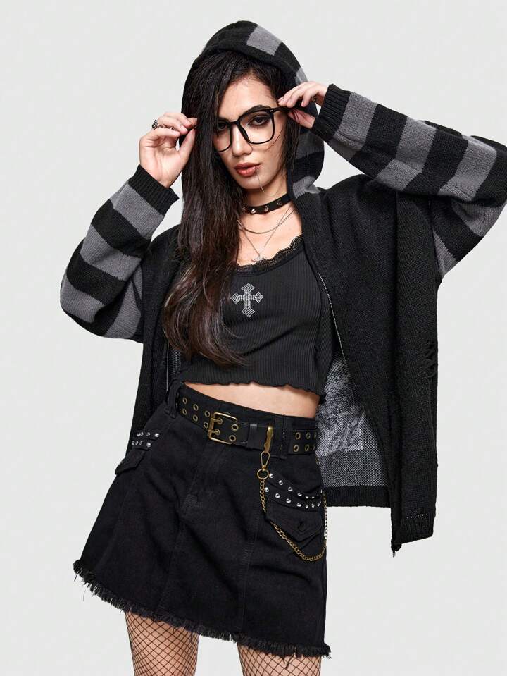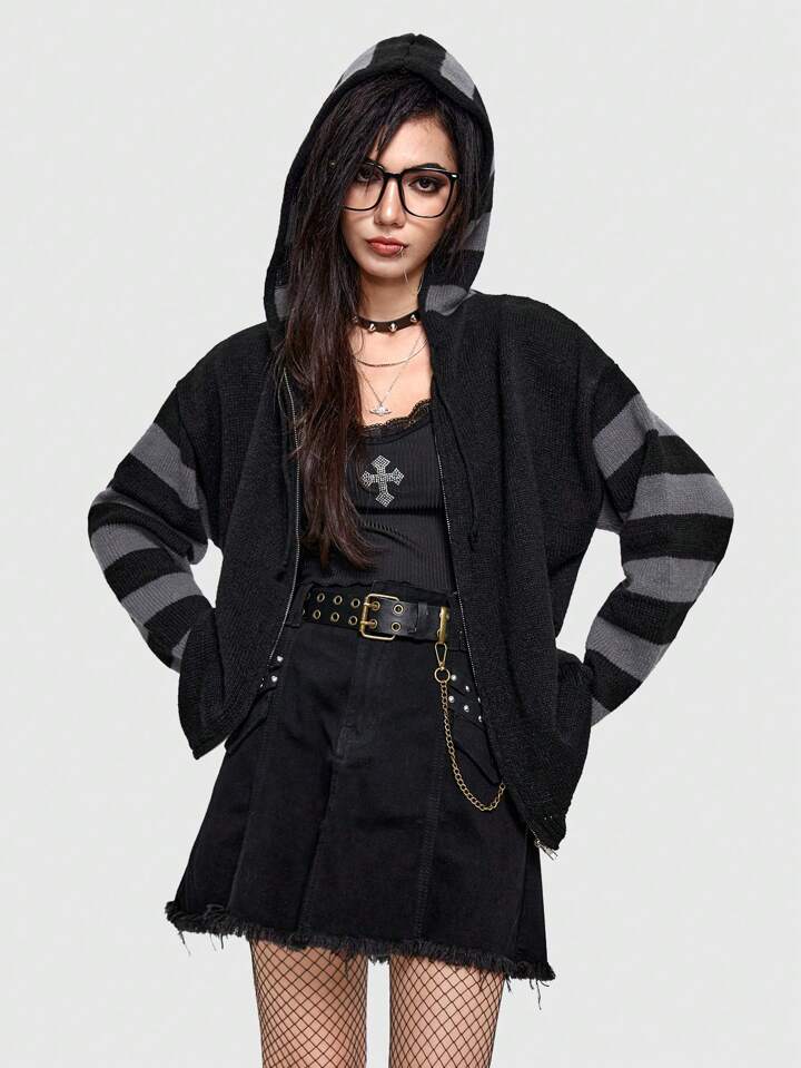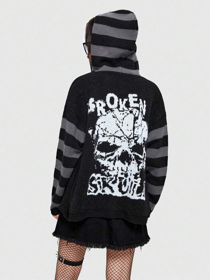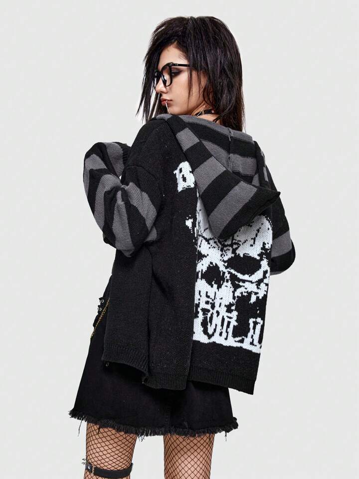 Grunge Punk Striped & Skull Pattern Drop Shoulder Cardigan