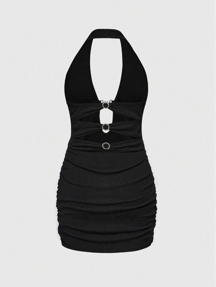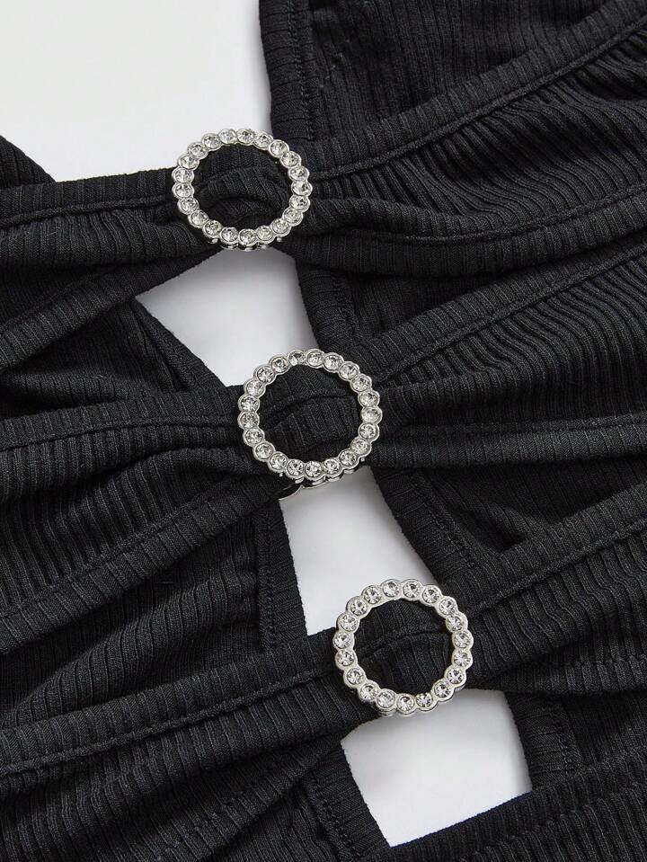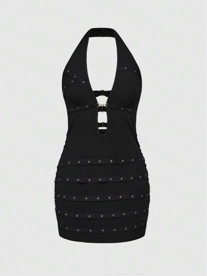 Grunge Punk Summer Beach Graduation Easter Dress Women Concert Nashville Vacation Music Festival Rock Rivet Rhinestone Tape Sleeveless Backless Deep V-Neck Sexy Black Mini Dress For Ladies