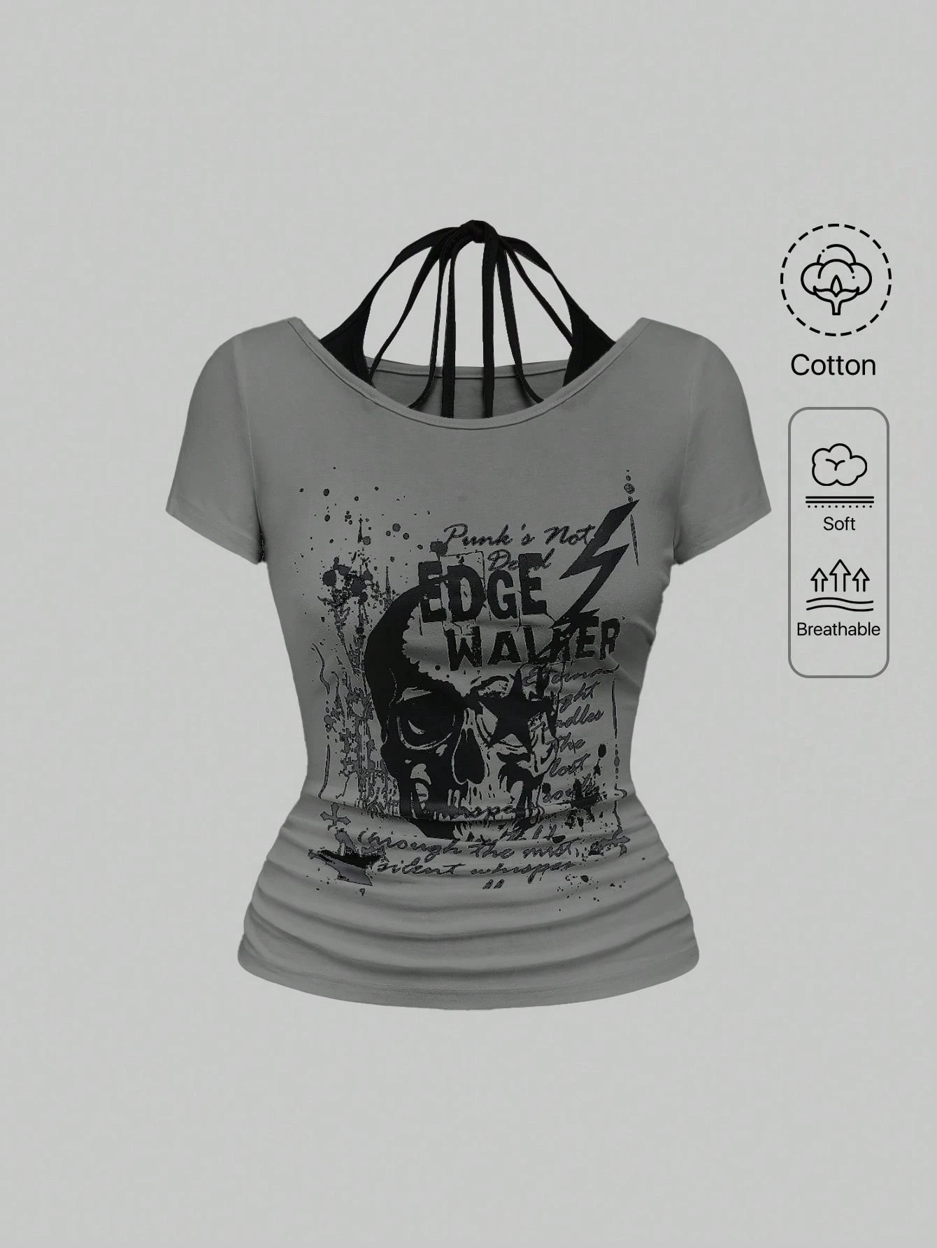 Grunge Punk Summer Vintage Y2K Skeleton & Star Print Women Tight Short Sleeve T-Shirt