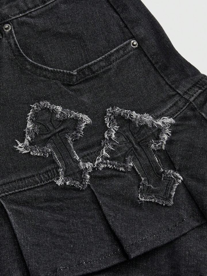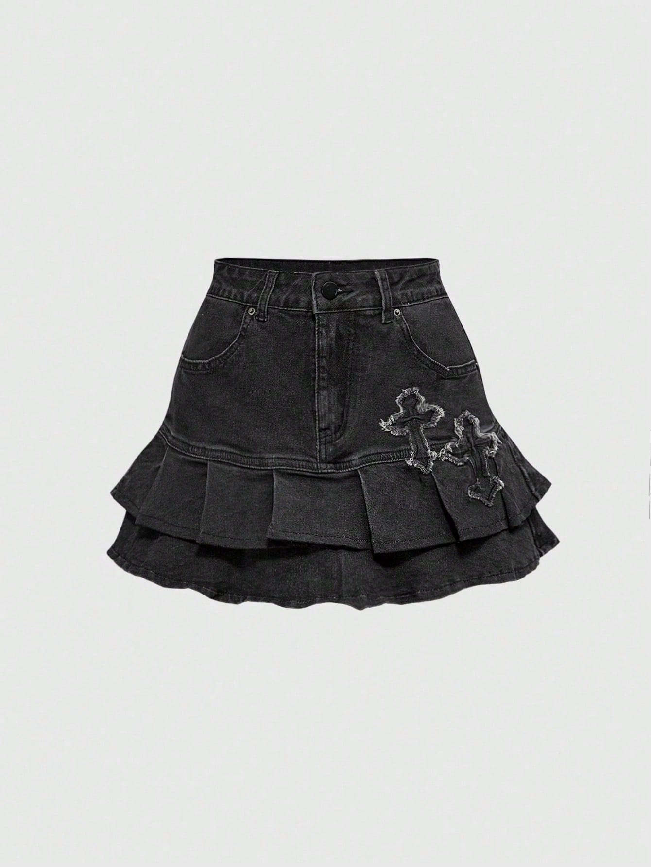 Grunge Punk Summer Y2K Vintage Music Festival Vacation Distressed Cross Embroidered Women's Double Layered Hemline Black Denim Mini Skirt
