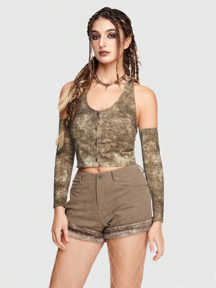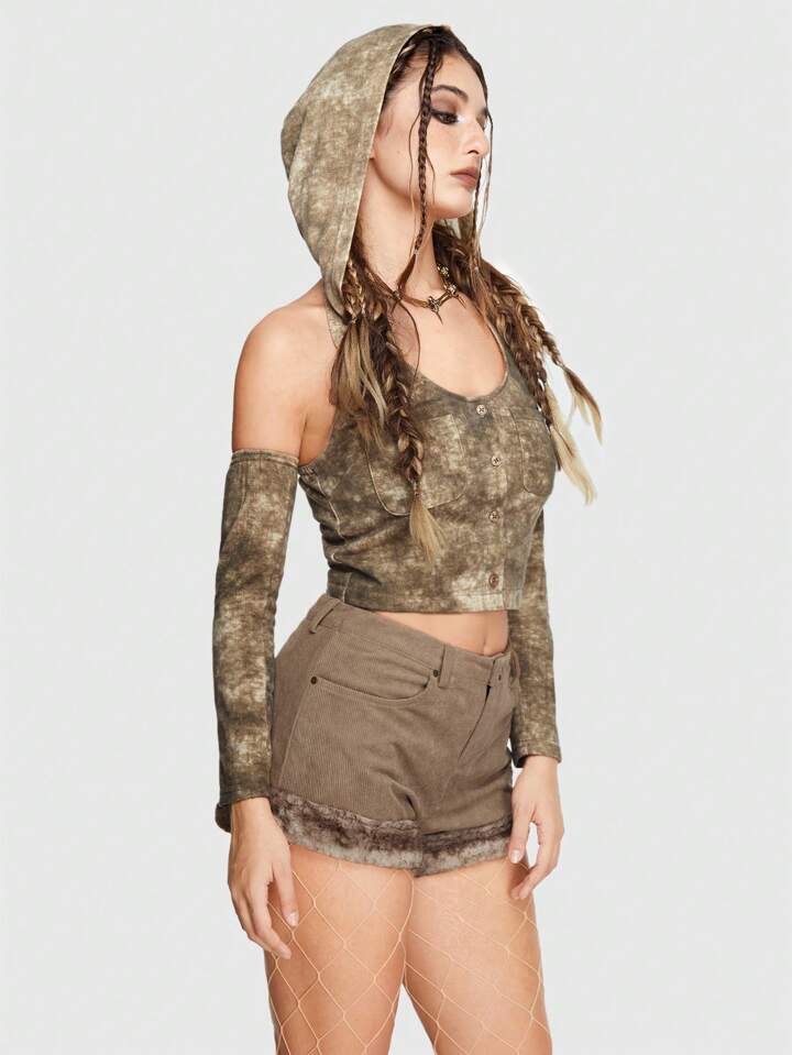 Grunge Punk Tie Dye Dual Pocket Hooded Crop Tank Top Without Arm Sleeves