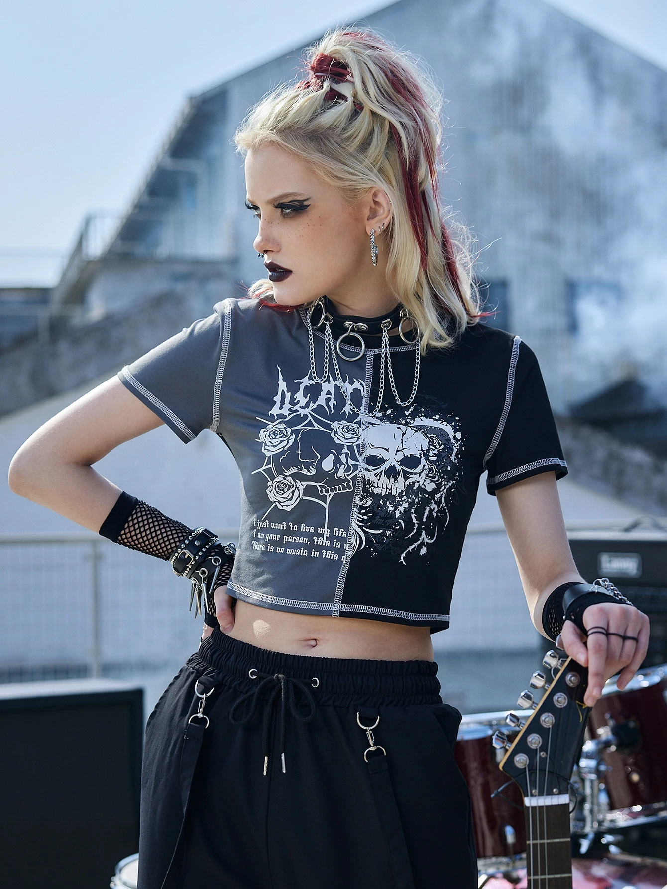 Grunge Punk Two Tone Stitching Trim Letter Graphic Crop Tee