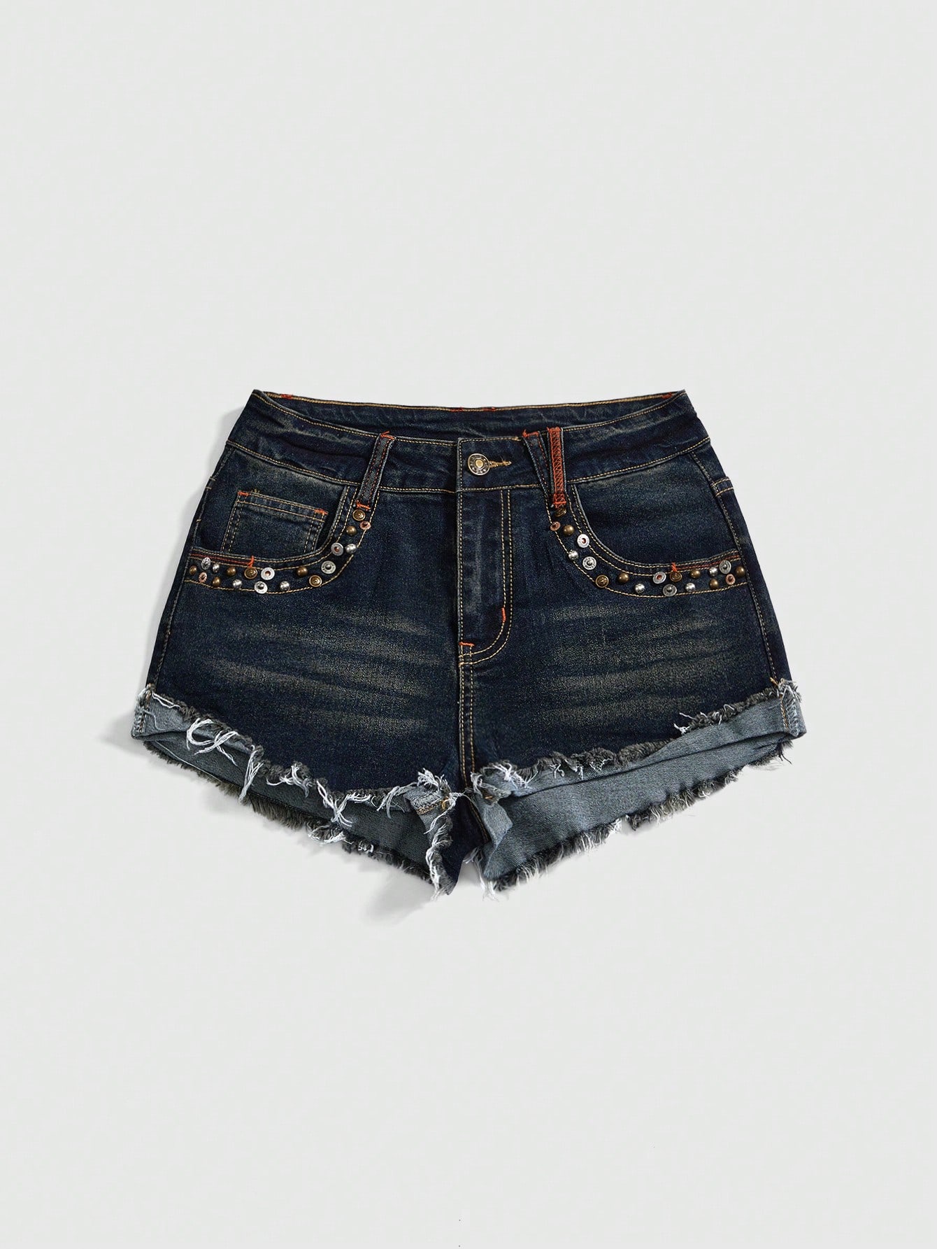 Grunge Punk Vintage Distressed Rivet Design Women Denim Shorts, Street Style