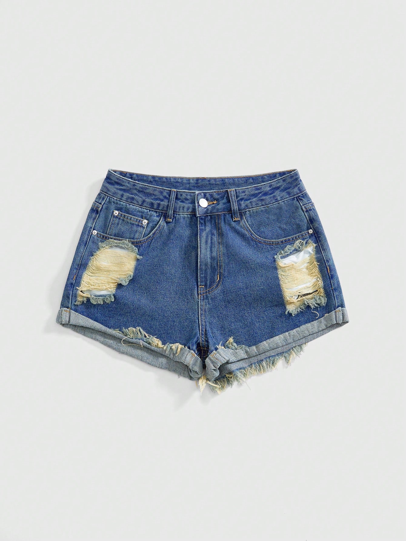 Grunge Punk Vintage Distressed Sexy Versatile Blue Denim Shorts, Boyfriend Style For Women