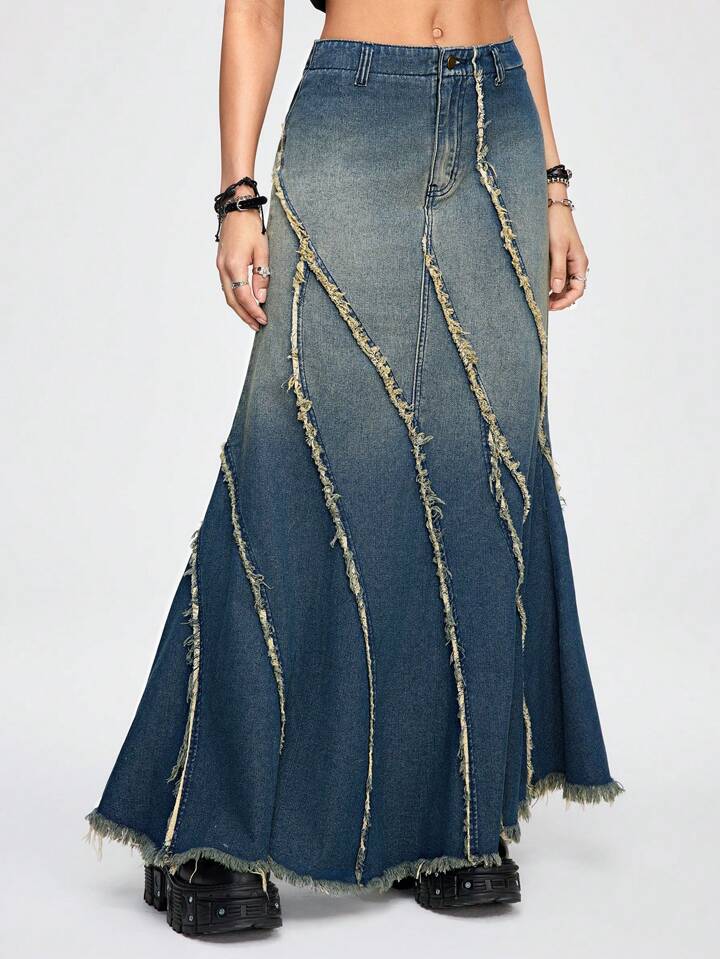 Grunge Punk Vintage Faded Heavyweight Ruffle Hem Women Low Waist Denim Mermaid Skirt