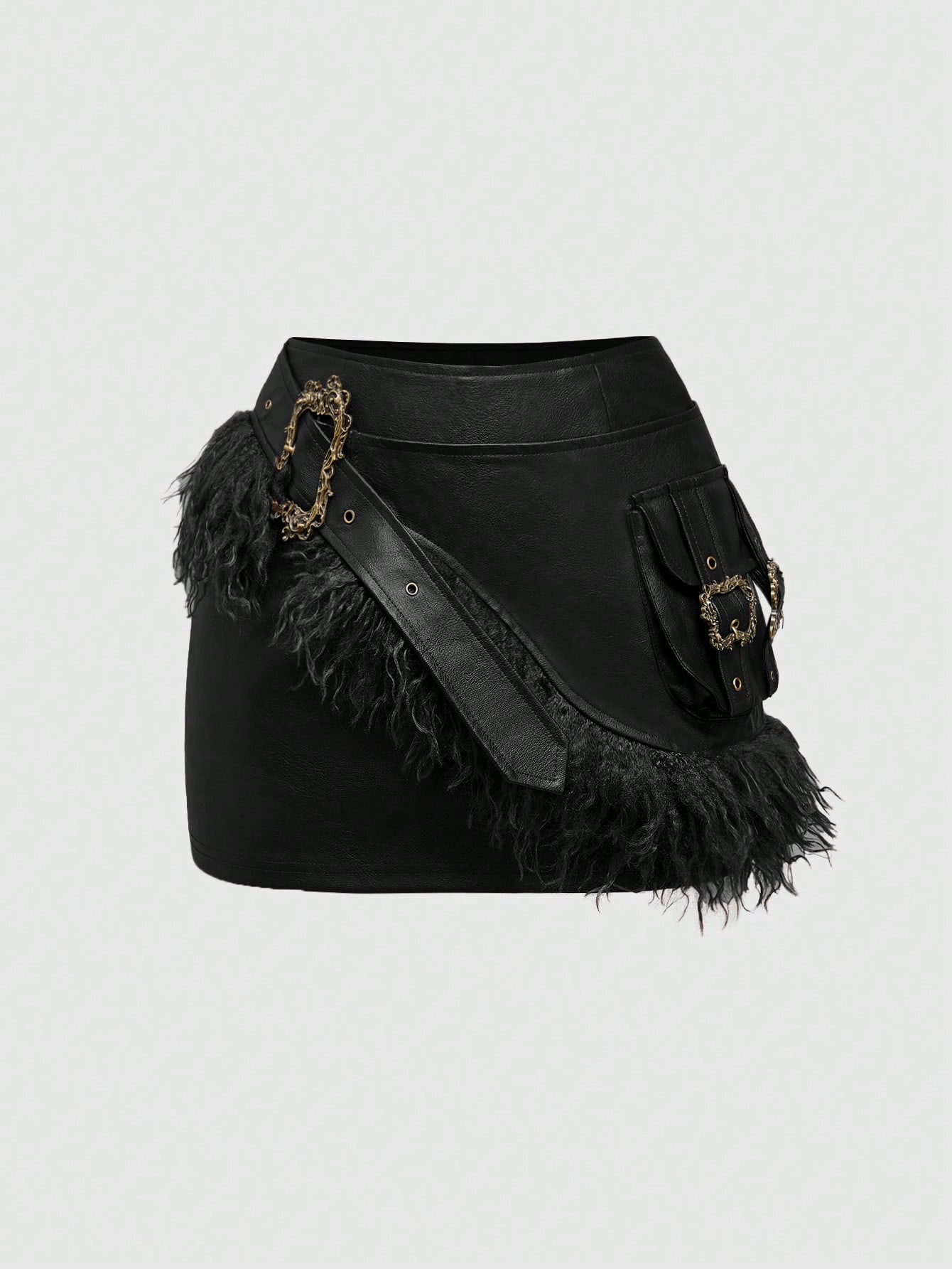 Grunge Punk Vintage Millennium Hot Girl Inspired PU Patchwork Punk Furry Waist Bag Pockets Decor A-Line Skirt