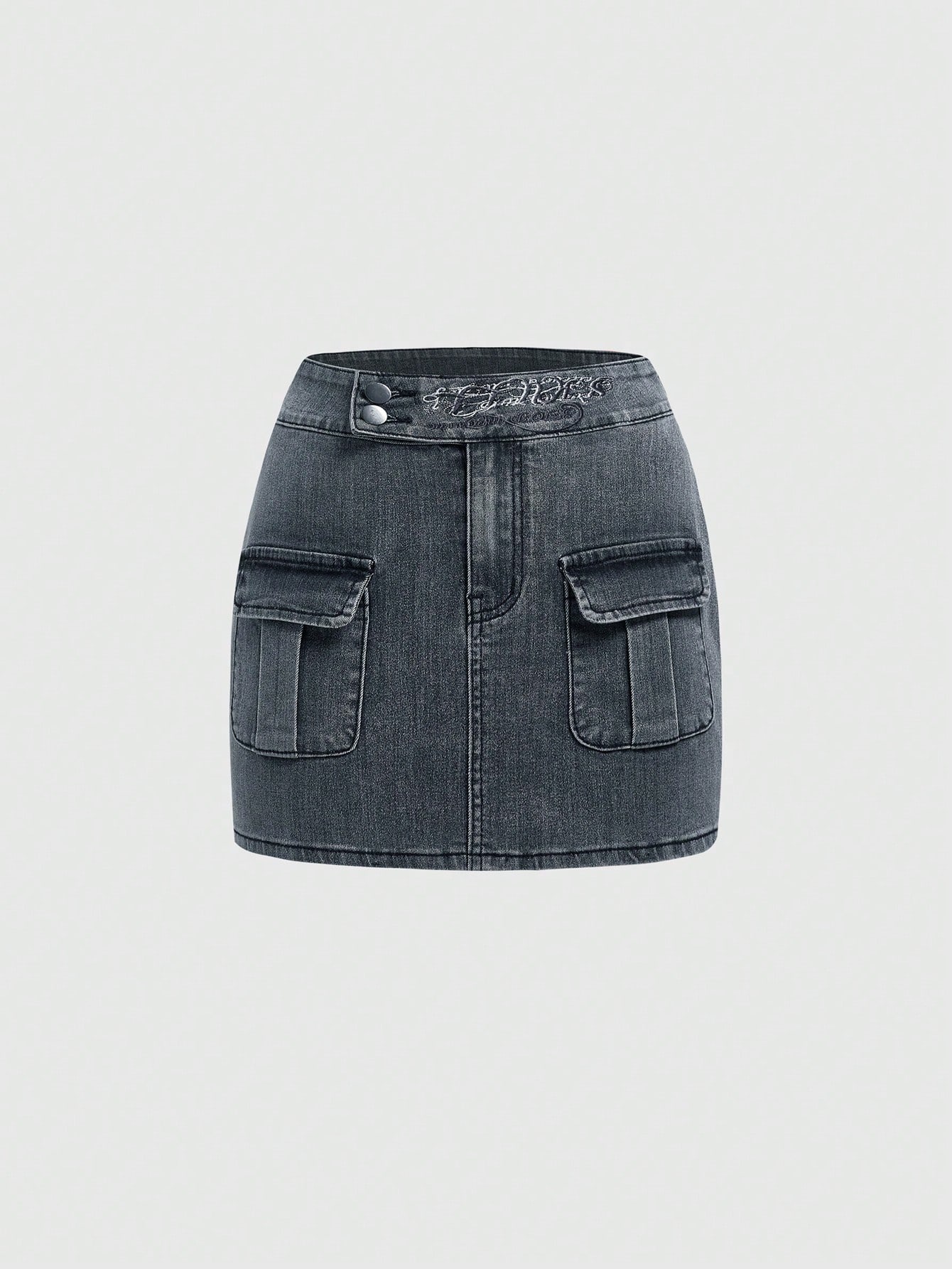Grunge Punk Vintage Sexy Slogan Embroidery Washed Denim Mini Skirt, Music Festival Style