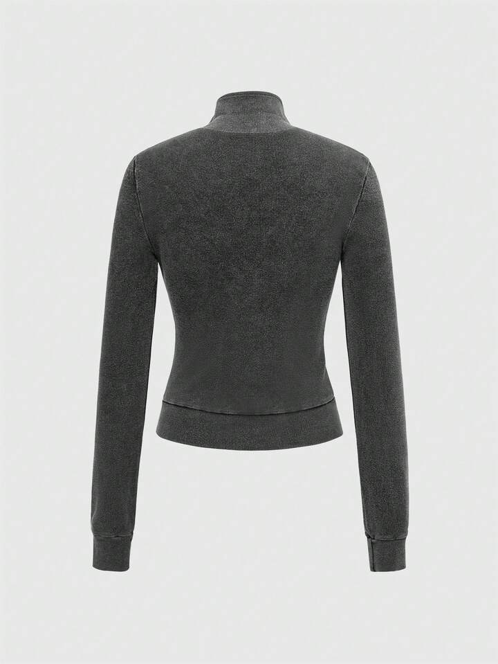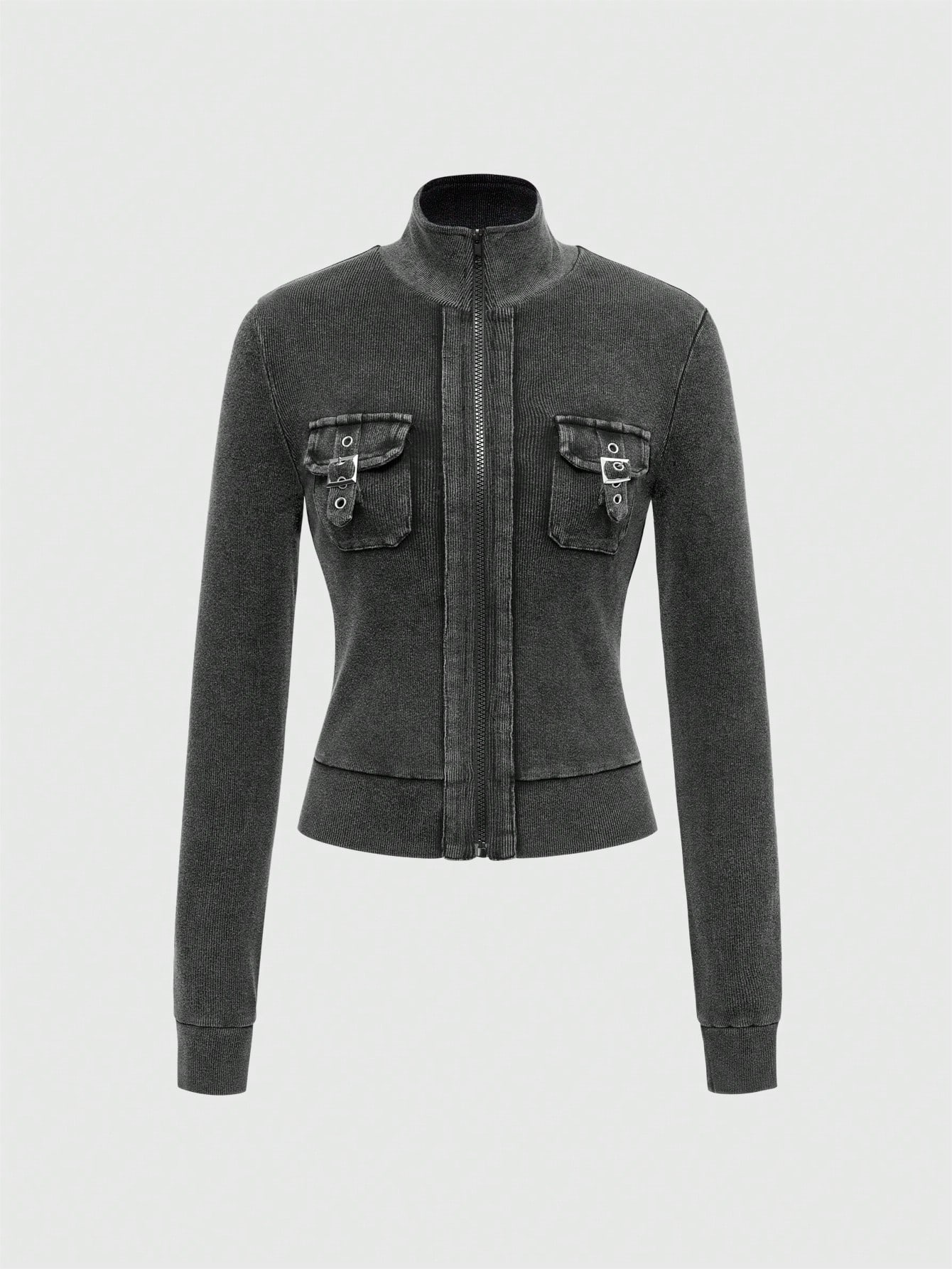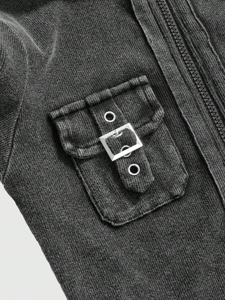 Grunge Punk Washed Zip Front Cargo Pocket Skinny Long Sleeve