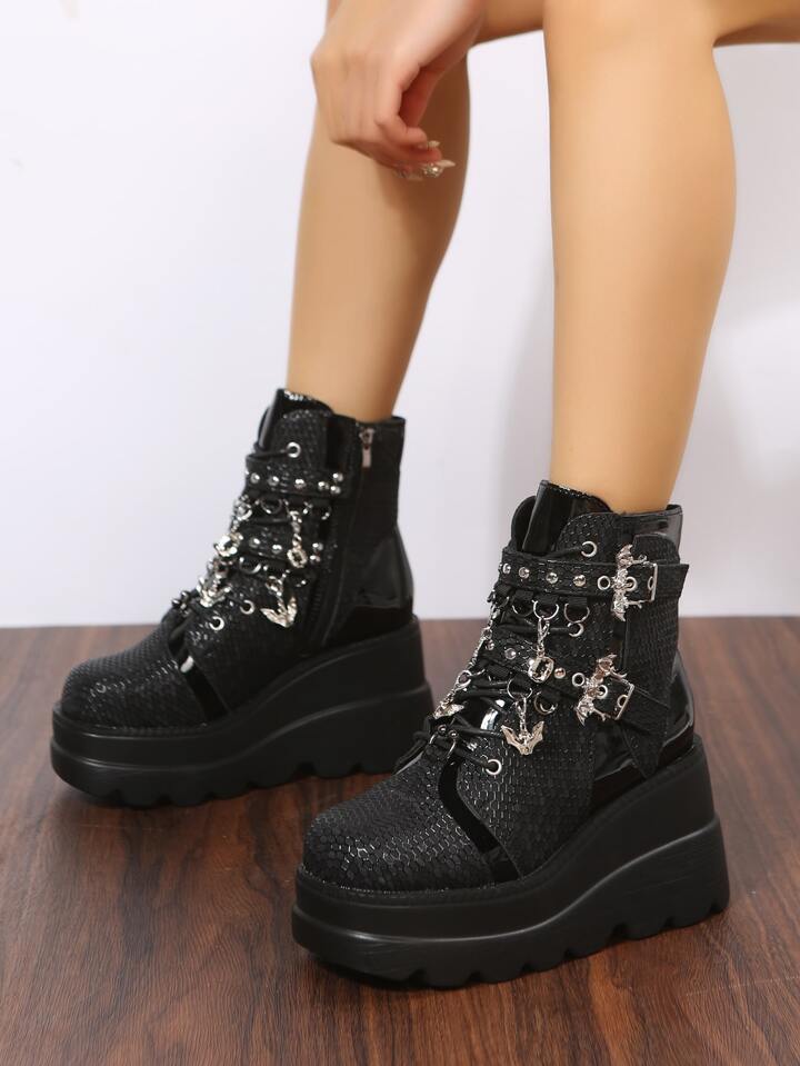 Grunge Punk Women Bat Design Chain Decor Double Buckle Wedge Boots Lace-up Front Punk Wedge Boots Black