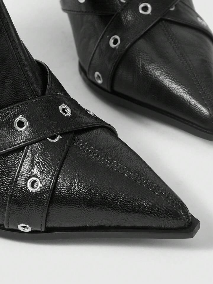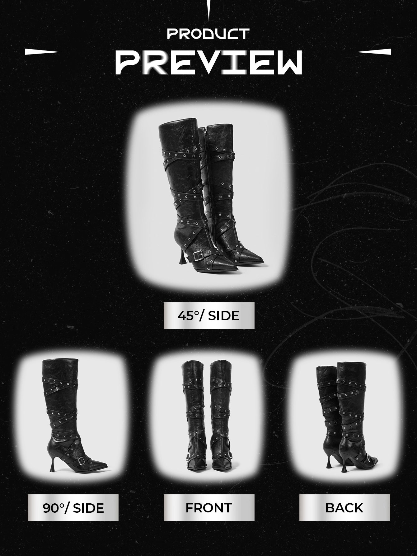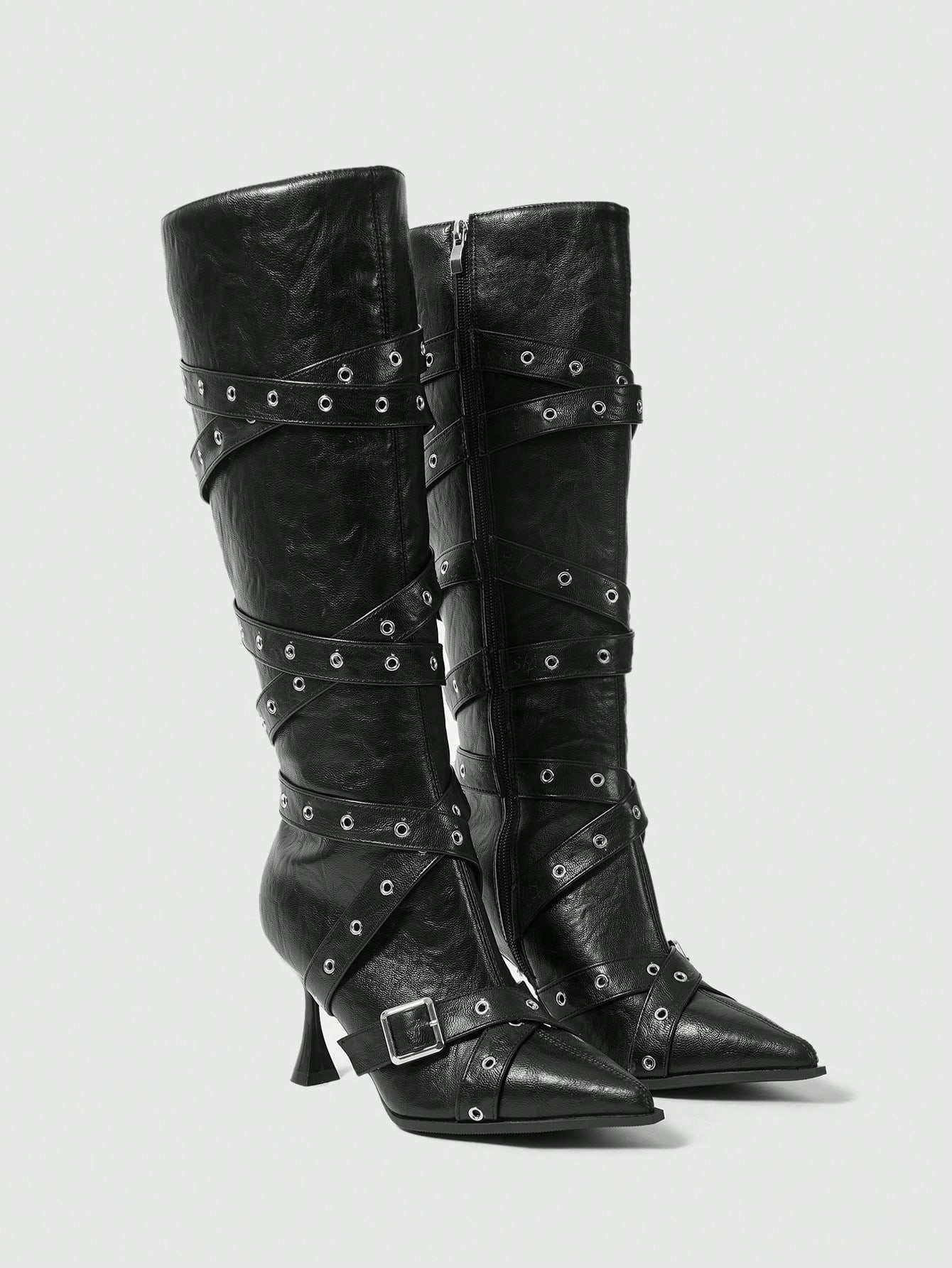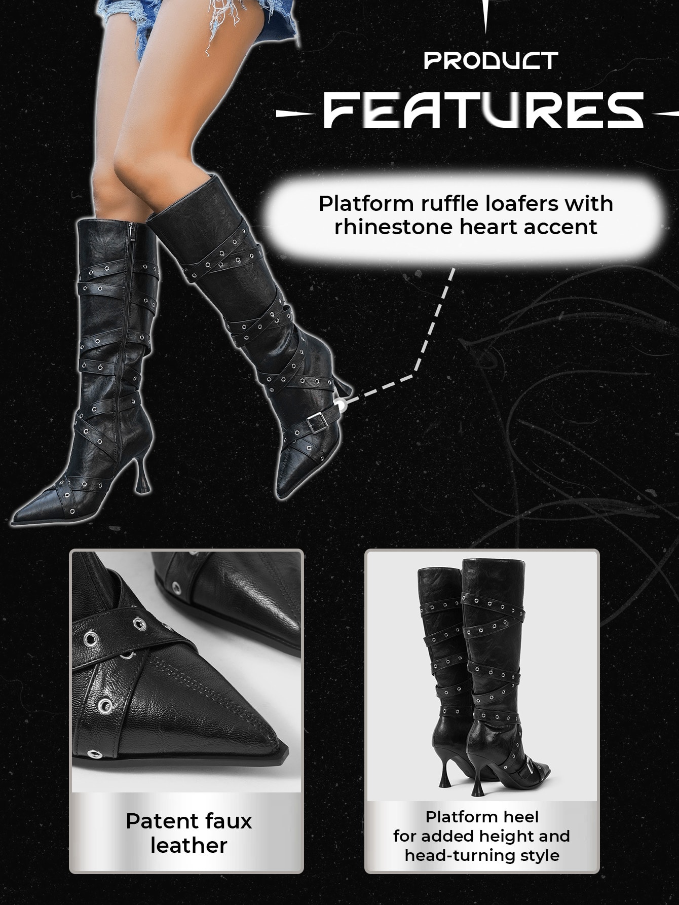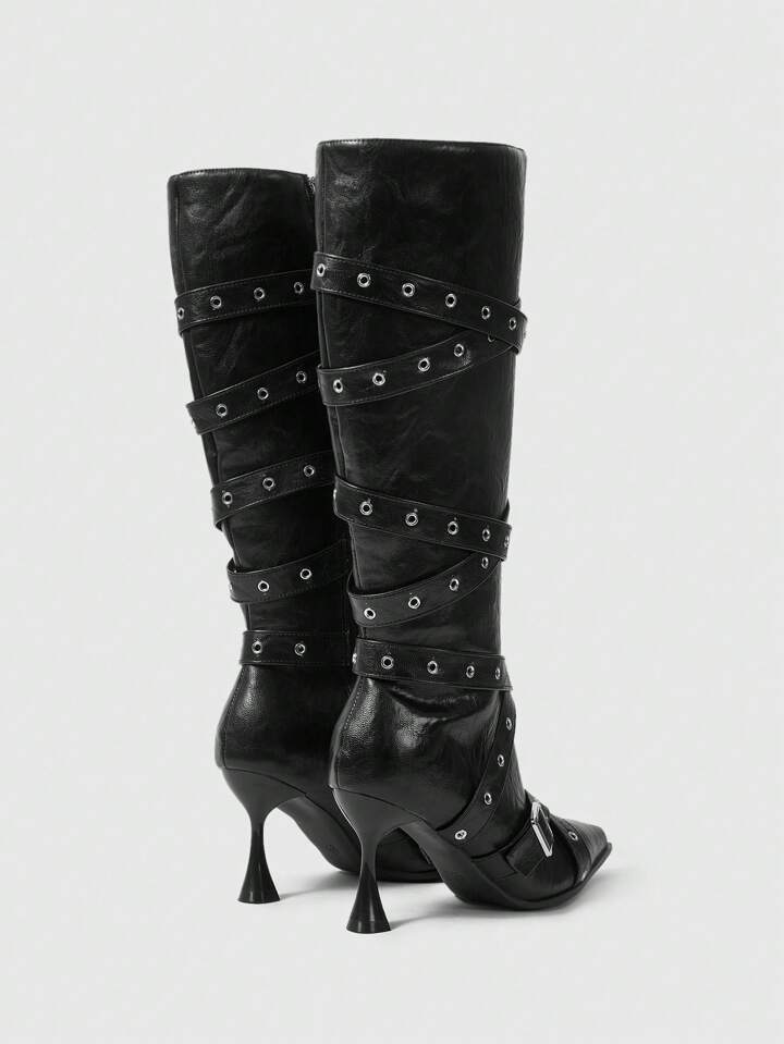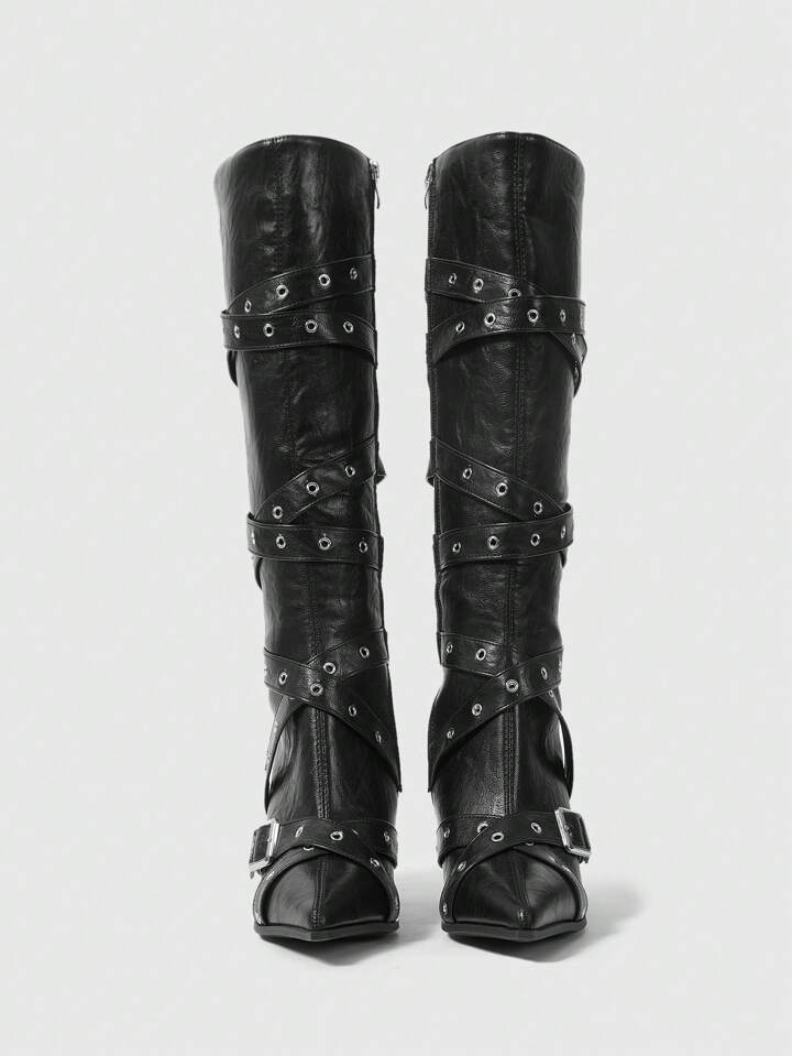 Grunge Punk Women Gothic Style Buckle Strap Pointed Toe Mid-Calf High Heel Boots New Year Holiday Valentines Valentine's Day Spring Shoes Prom Heels, Halloween