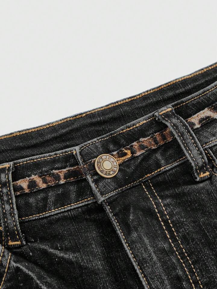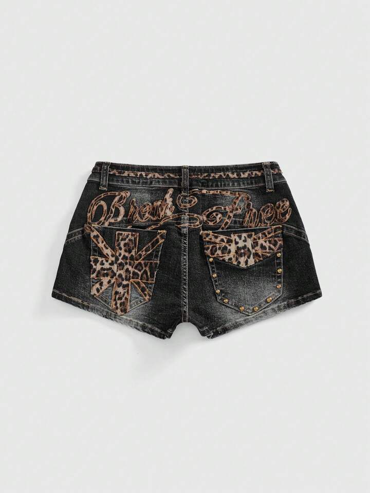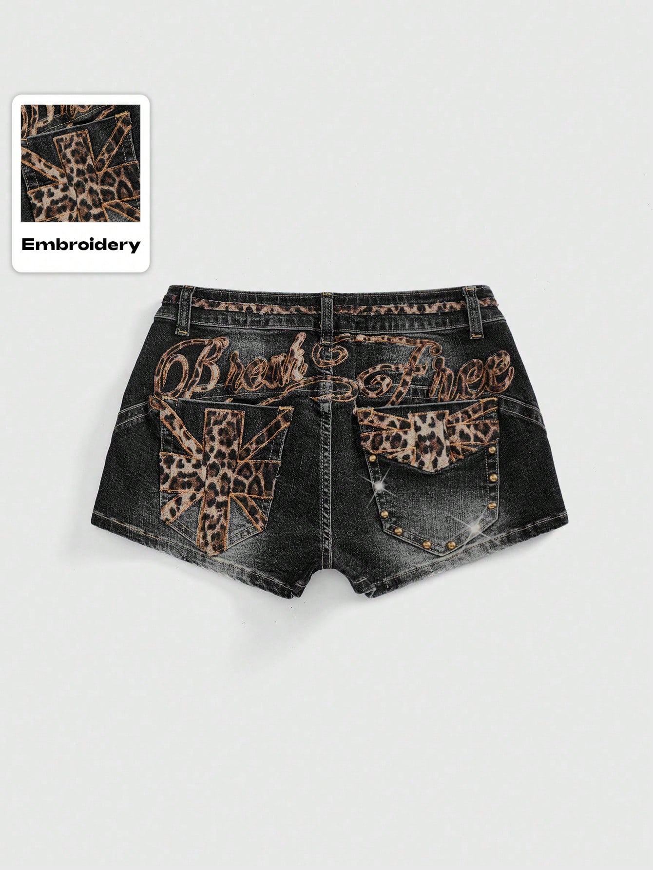 Grunge Punk Women Kpop Y2K Party Denim Shorts With Super Low Waist, Leopard Print Embroidery, Concert/Festival
