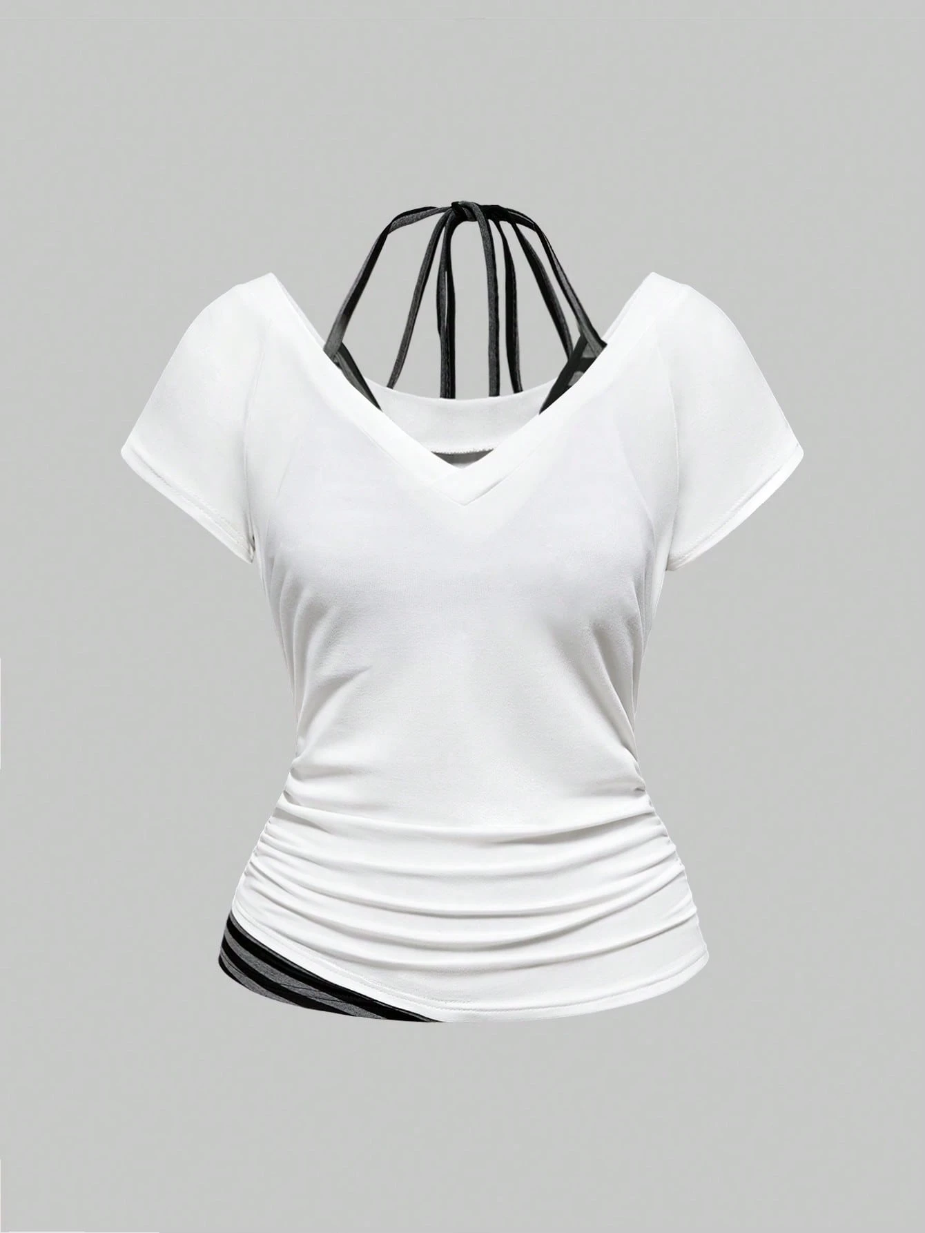 Grunge Punk Women Kpop Y2K Sexy Crop Top, V-Neck Contrasting Stripe, Halter Tie Bow Design, White
