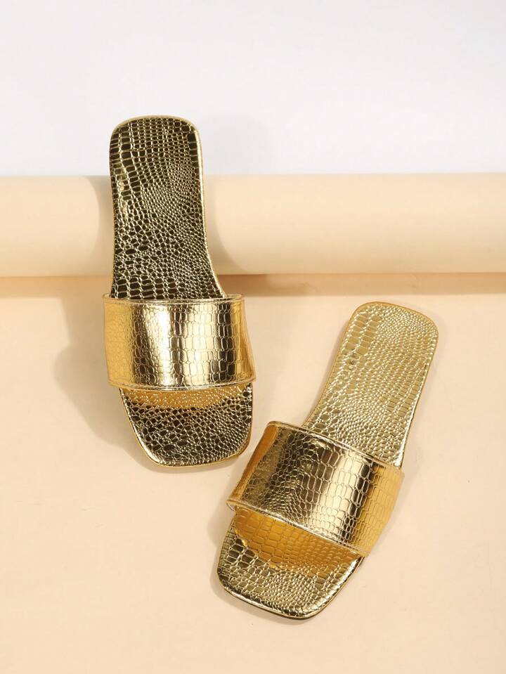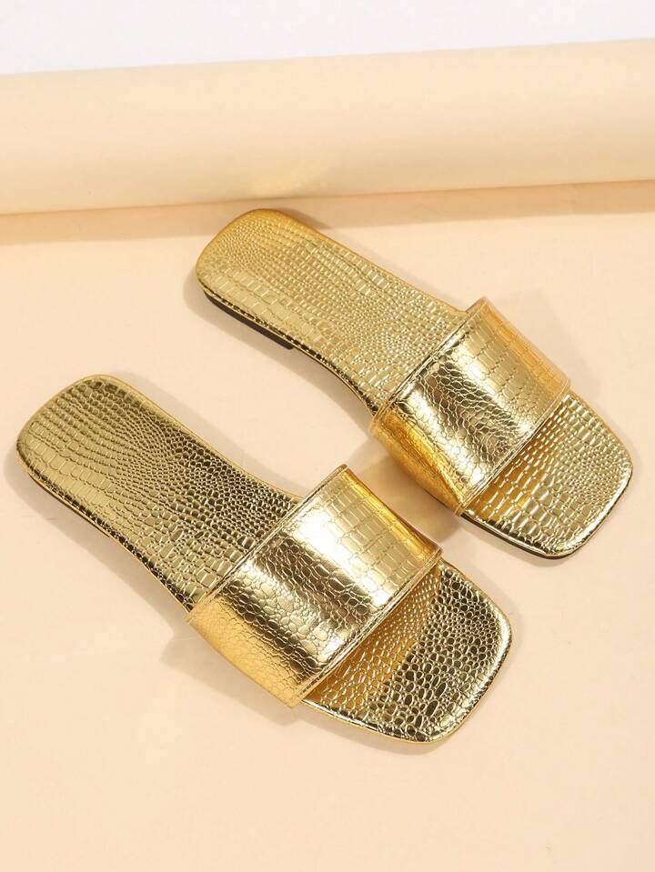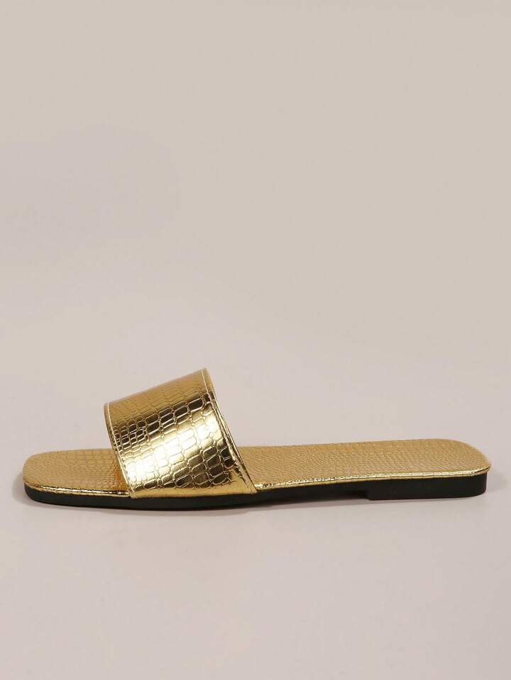 Grunge Punk Women Metallic Crocodile Embossed Slide Sandals, Funky Outdoor Flat Sandals