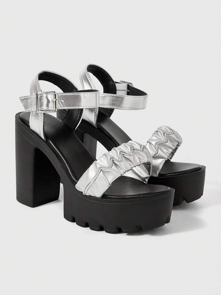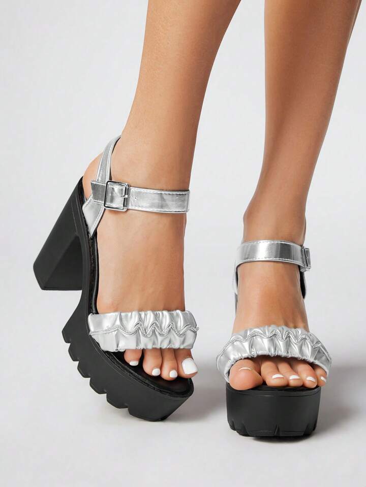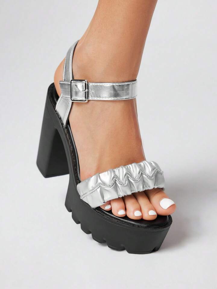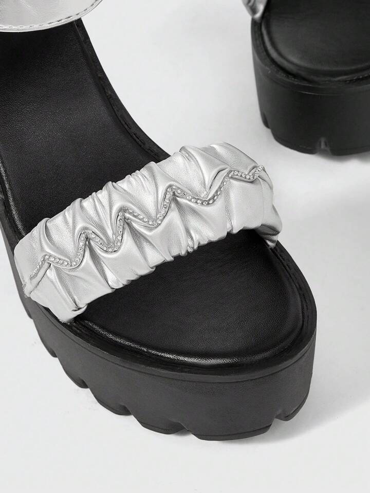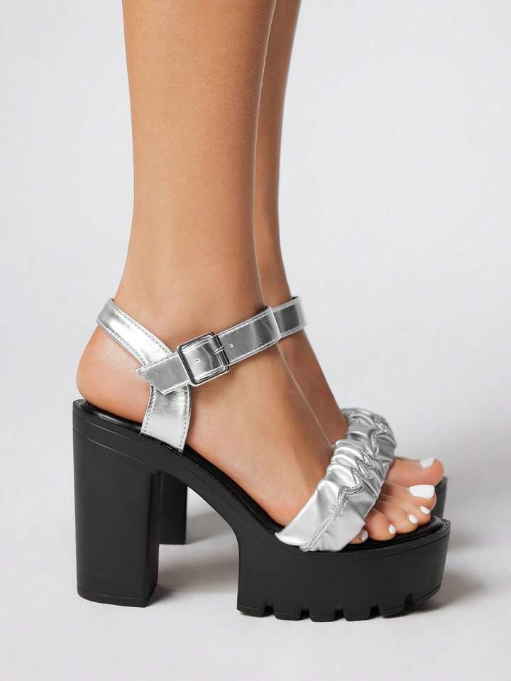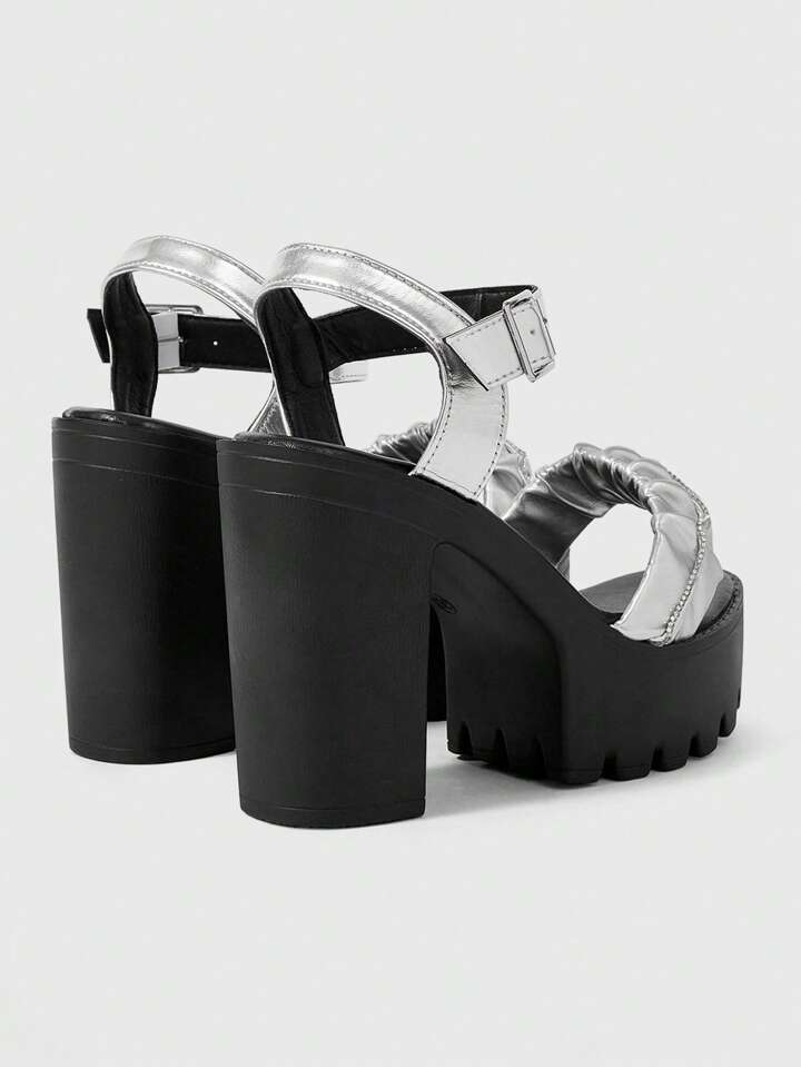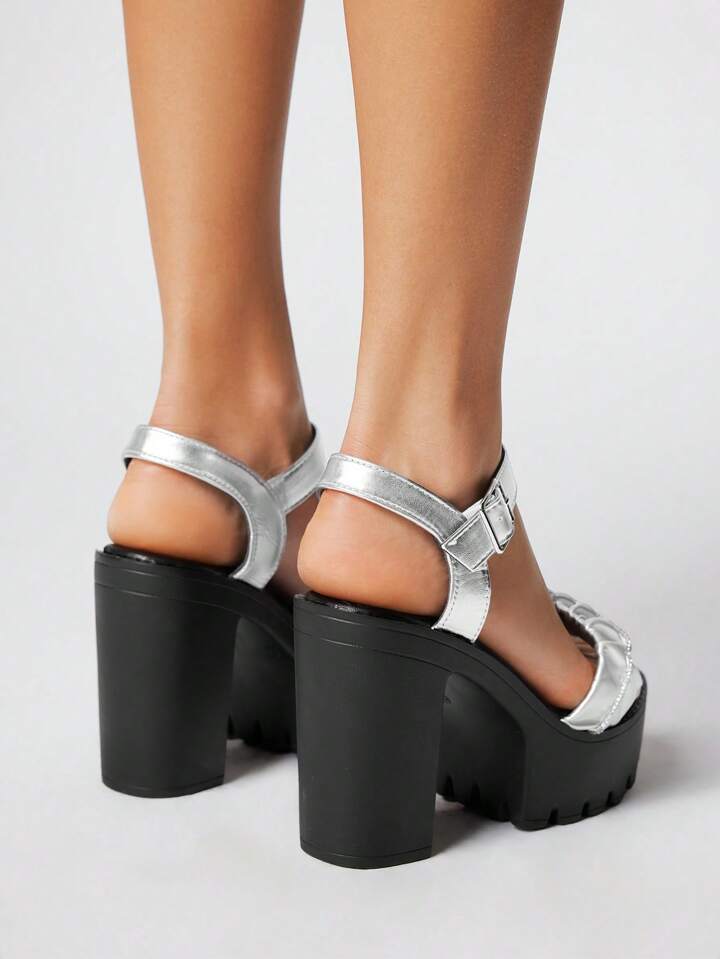 Grunge Punk Women Silver High Heel Shoes, Summer Open Toe Crystal Sparkling Party Dress Shoes, Chunky Heel Office Work Shoes, Strap Buckle Low Heel Ladies Sandals