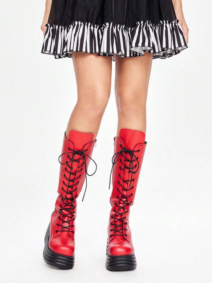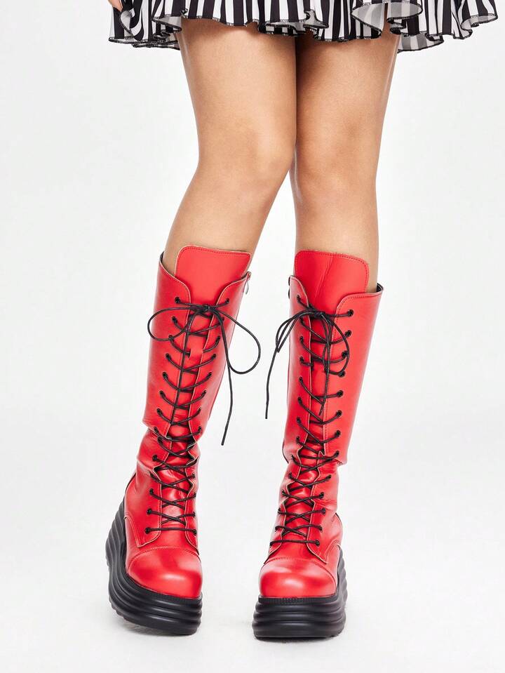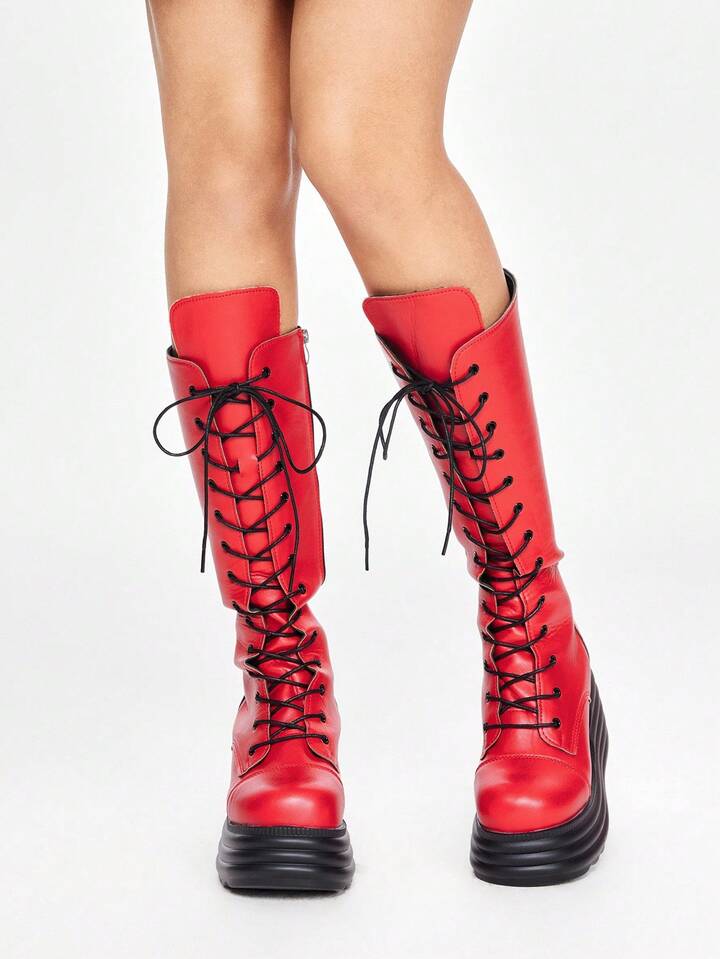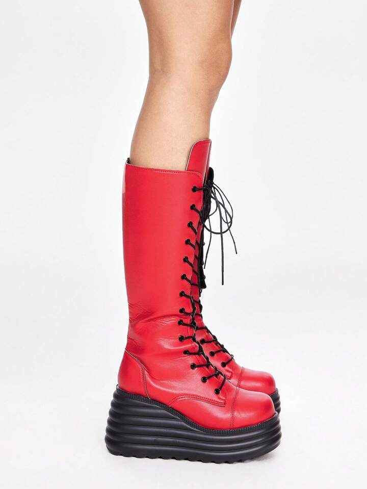 Grunge Punk Women's 2024 Autumn/Winter New Round Toe Lace-Up Side Zipper Punk Wine Red Platform Thick Sole Tall Boots