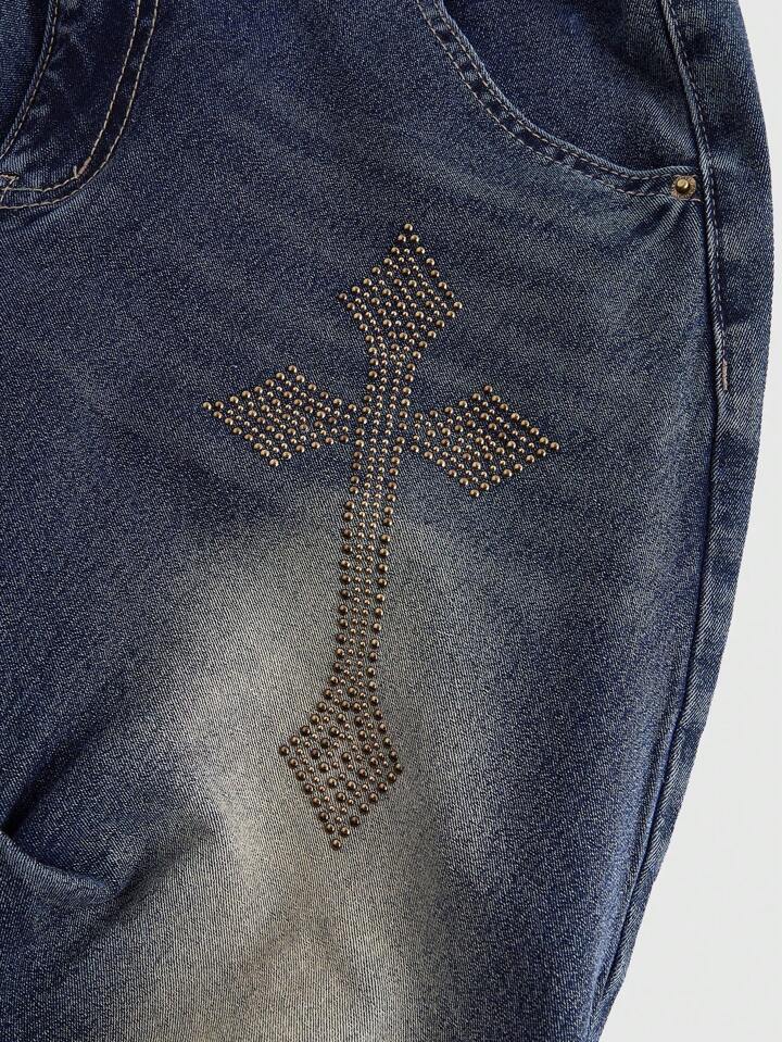 Grunge Punk Women's Distressed Wrinkle Cross Rhinestone Elastic Retro Washed Skinny Flare Jeans