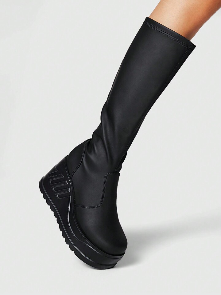 Grunge Punk Women's Elastic Round Toe Platform Chunky Heel Ankle Boots, Dark Punk PU Black Mid-Calf Boots For Casual, Dark Rock, Campus Wear