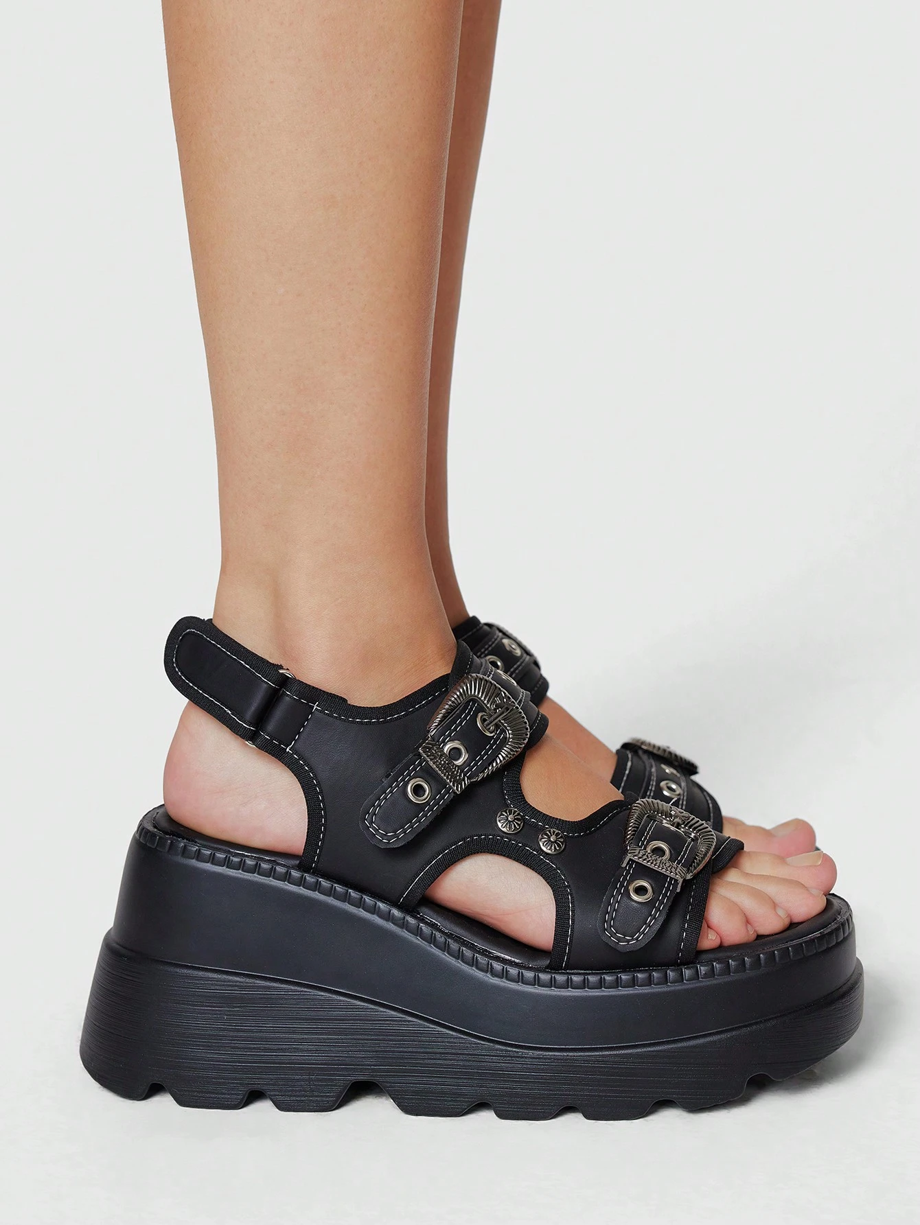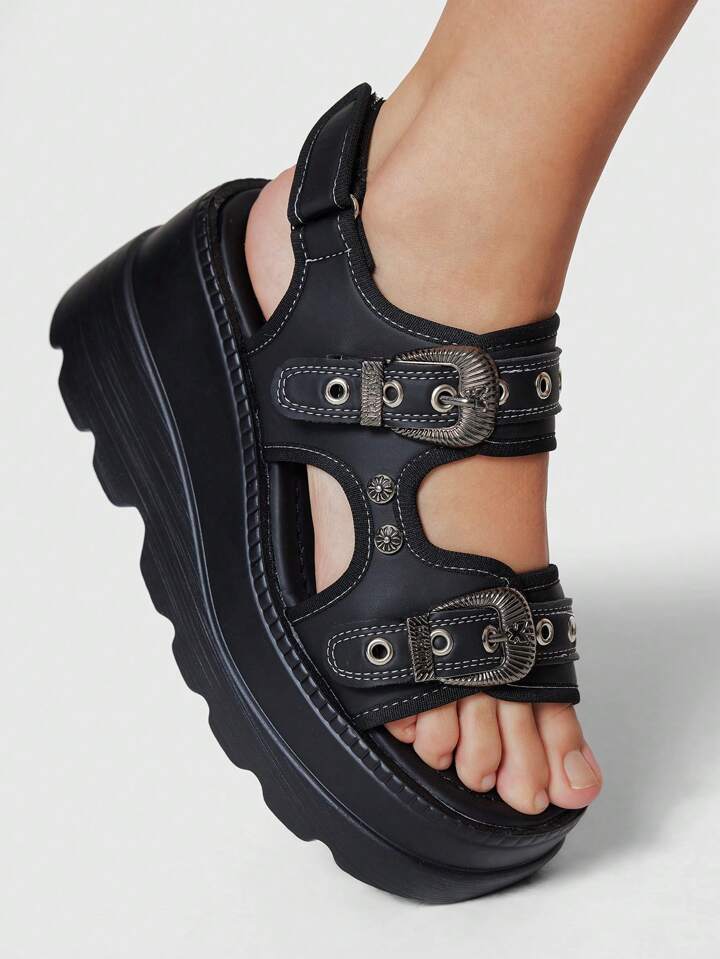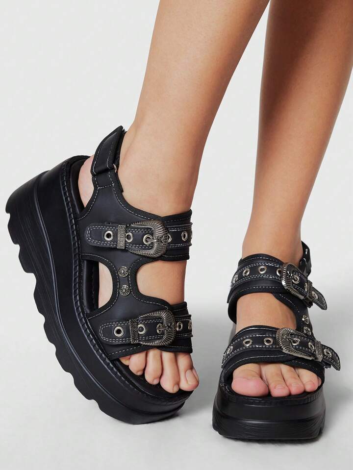 Grunge Punk Women's Gothic Punk Style Platform Sandals, Black Summer Open Toe Rivet Roman Beach Wedge Heels, Halloween