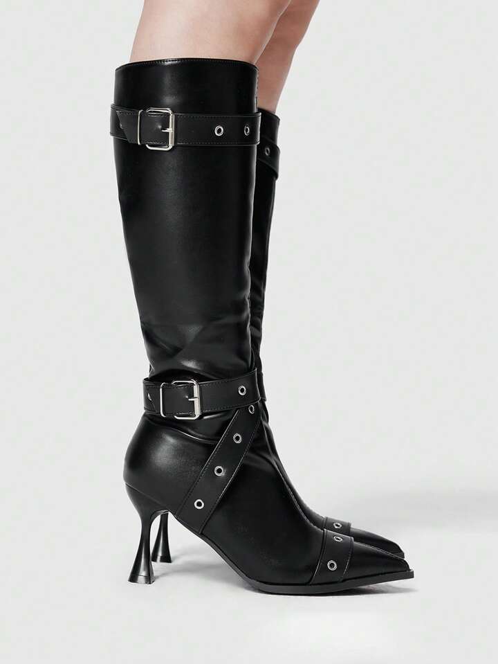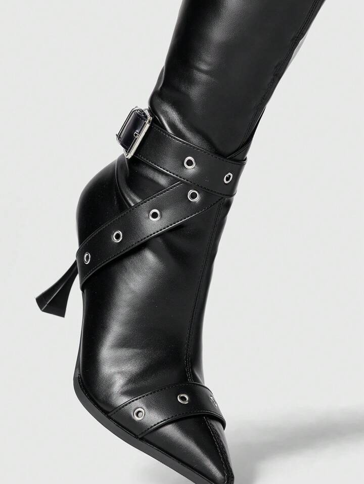 Grunge Punk Women's Gothic Style Buckle Strap Pointed Toe Mid-Calf Boots, Fashion Spring Shoes Prom Heels