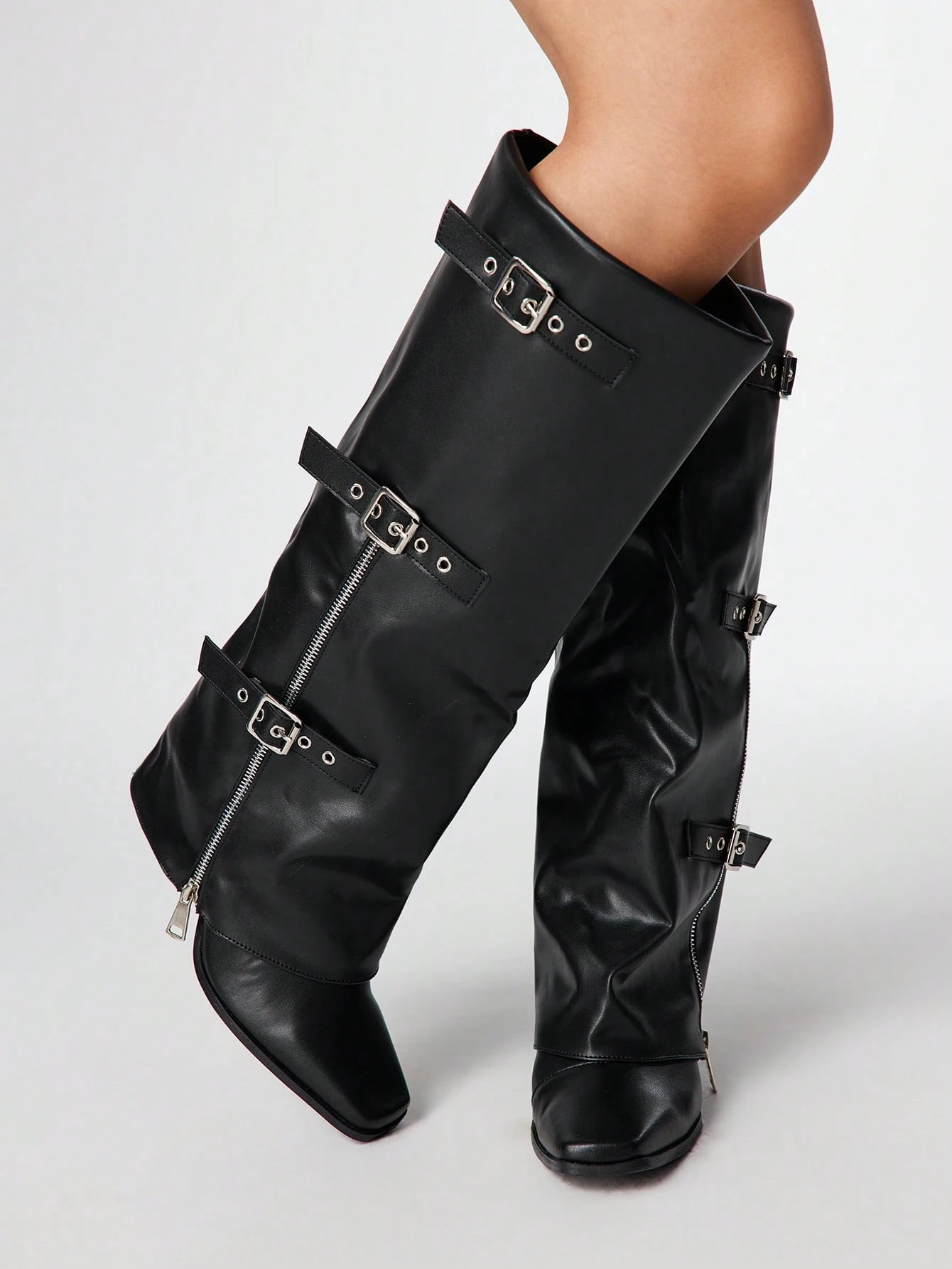 Grunge Punk Women's Multiple Buckle Zipper Decor Square Toe Stiletto Heel Tall Boots For Christmas