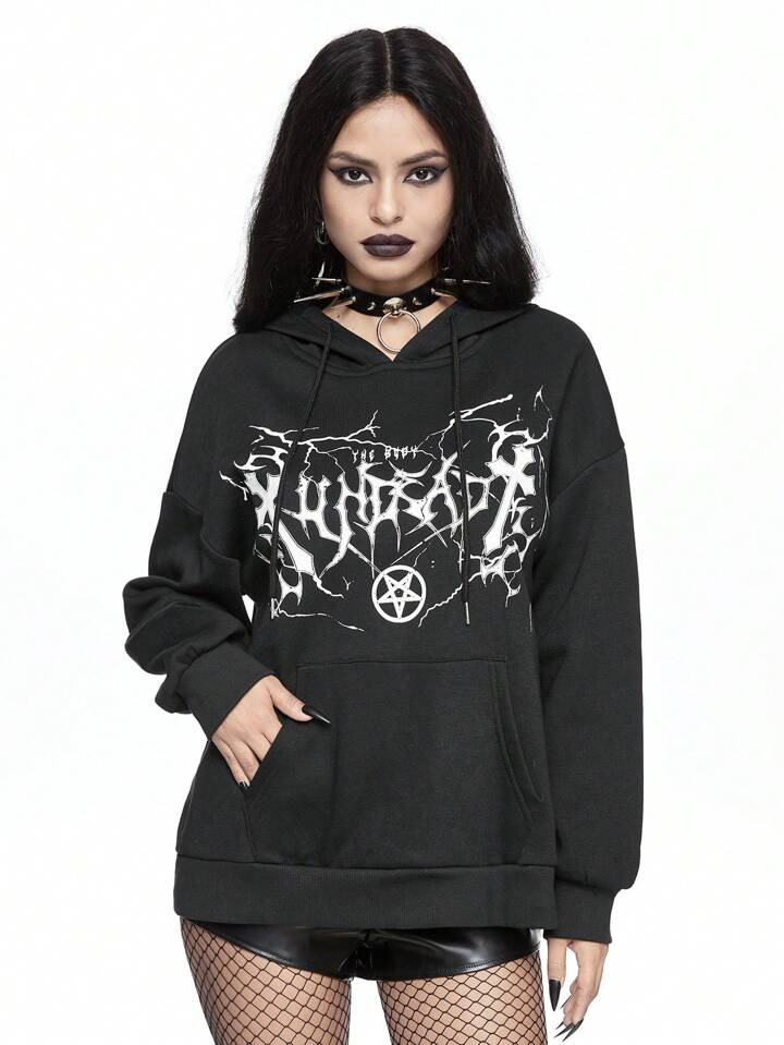 Grunge Punk Women's Punk Style Cross & Lightning Print Hoodie Sweatshirt