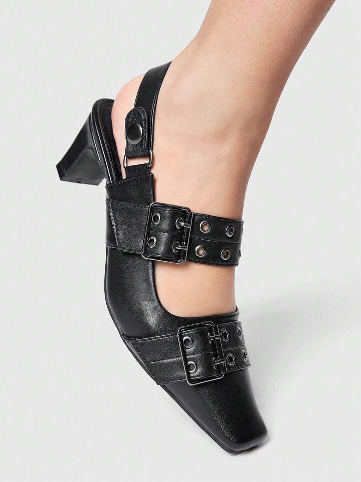 Grunge Punk Women's Punk Style Square Buckle Black Motorcycle Backless Clogs, Mules Sandals High Heel