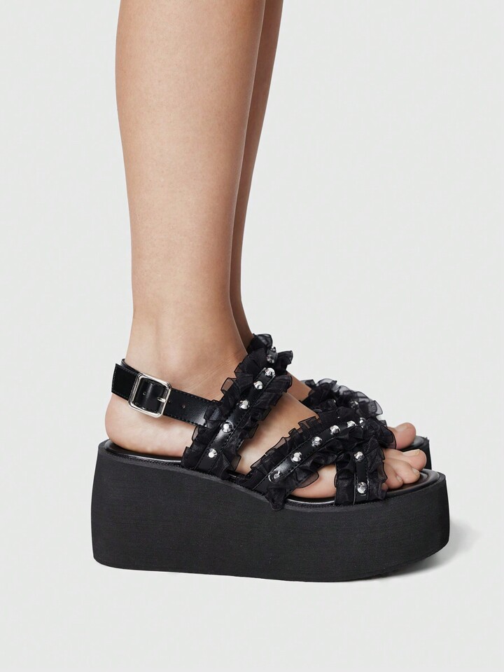 Grunge Punk Women's Retro Round Toe Thick Platform Wedge Heel Strappy Roman Sandals. Black PU Upper, Suitable For Graduation Photos, Casual Wear Spring Shoes Spring Break Easter