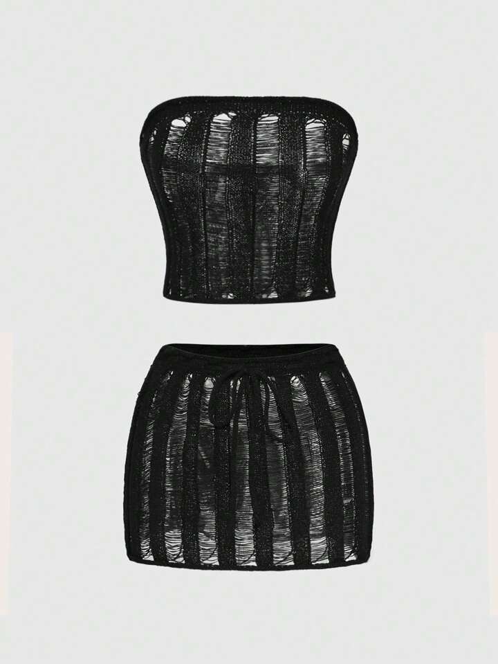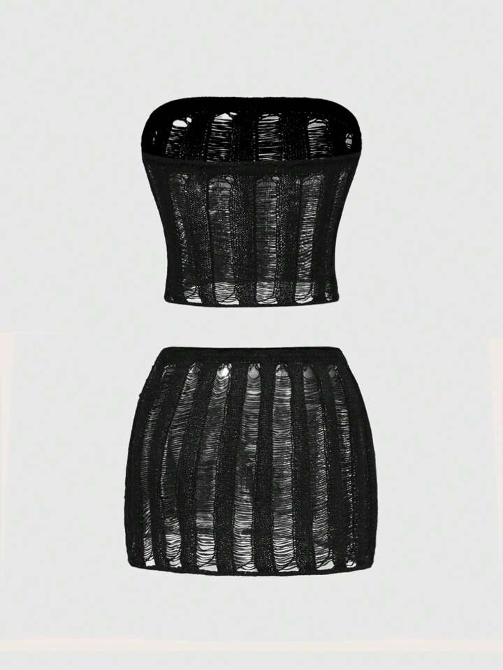 Grunge Punk Women's Sexy Dark Bandeau Super Short Bodycon Skirt, Thin Hollow Out Knitted Bandeau & Mini Skirt 2pcs Set