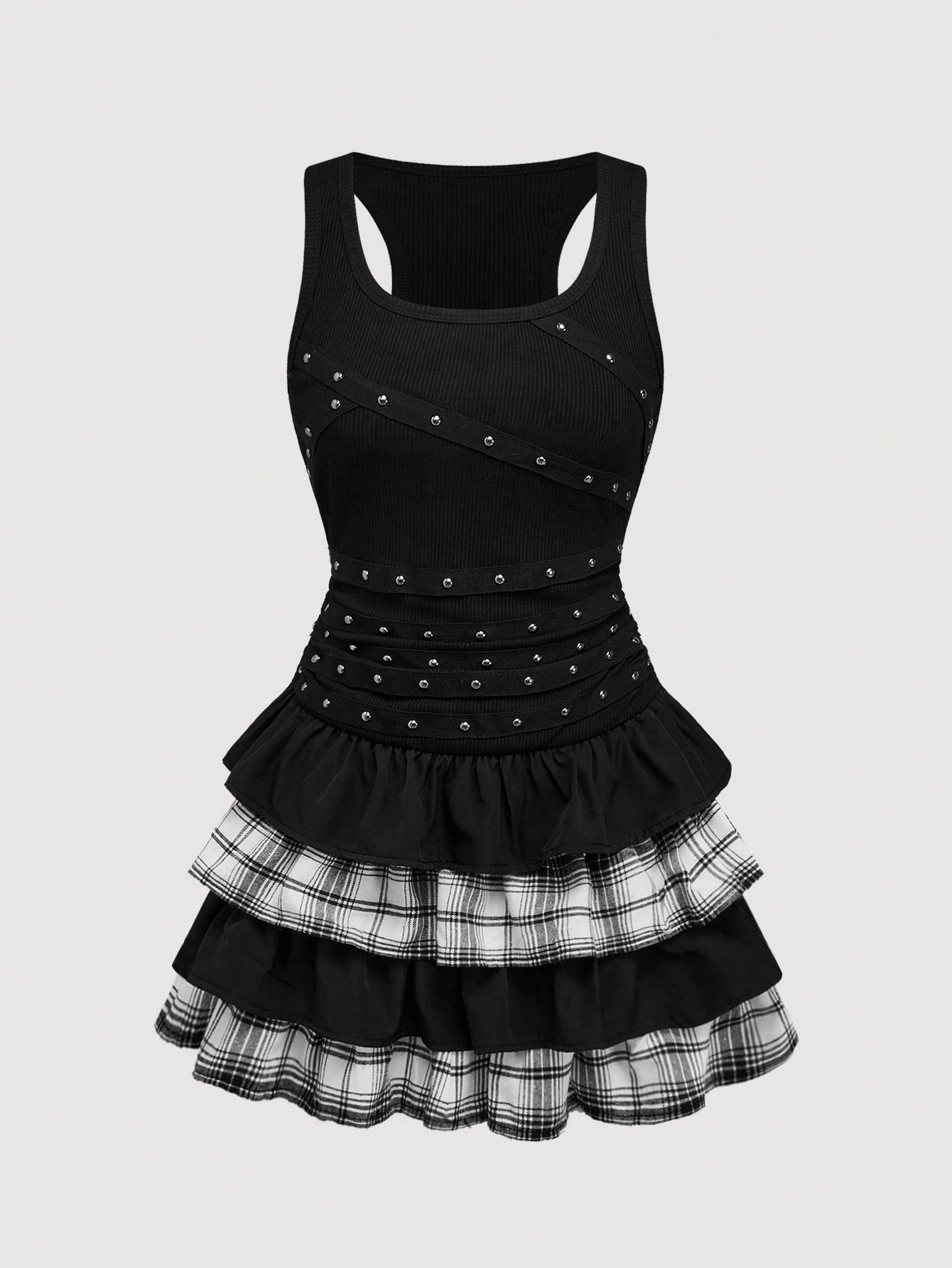 Grunge Punk Women's Summer Fashion Plaid Patchwork Ruffle Hem Short Casual Dress