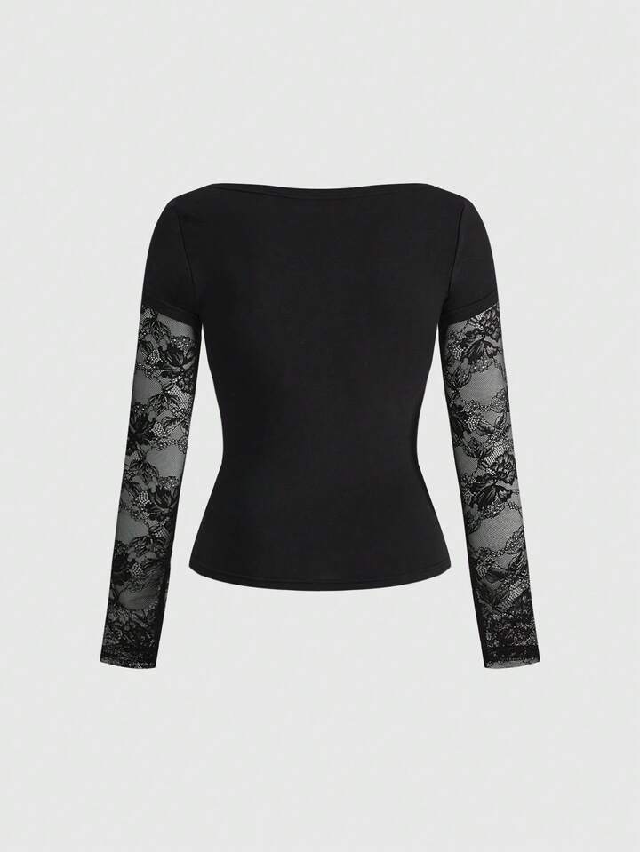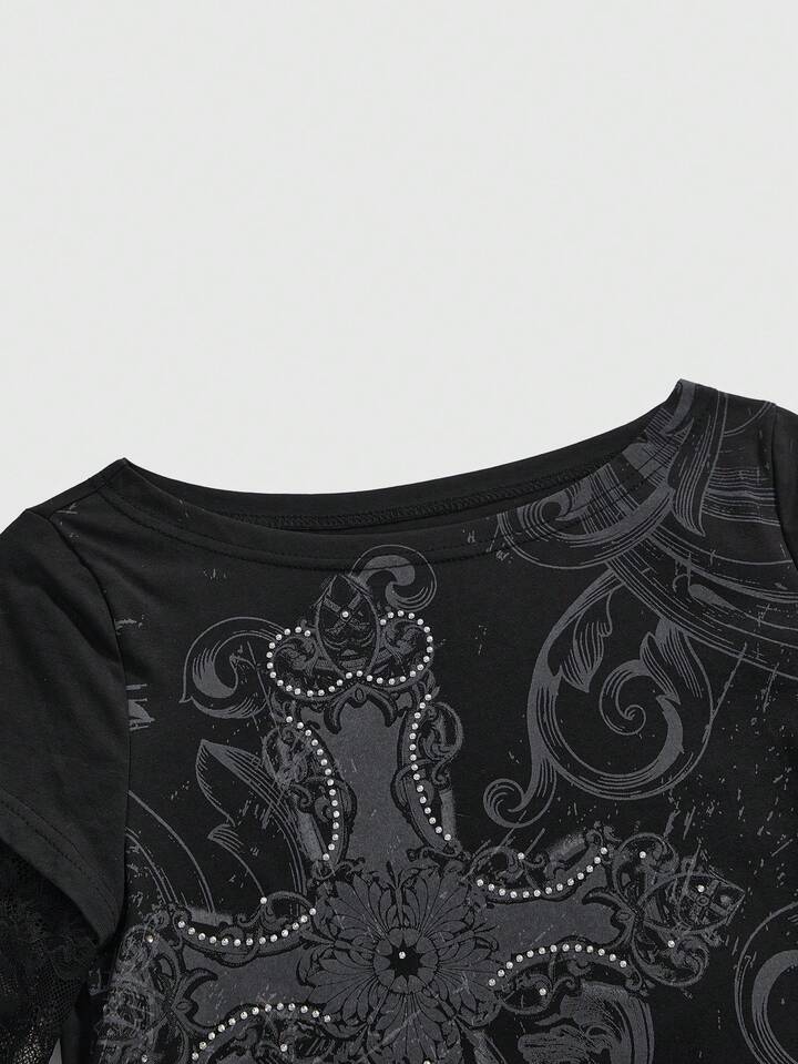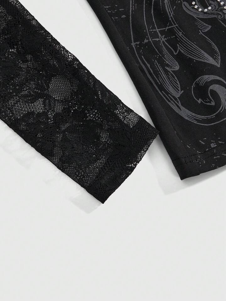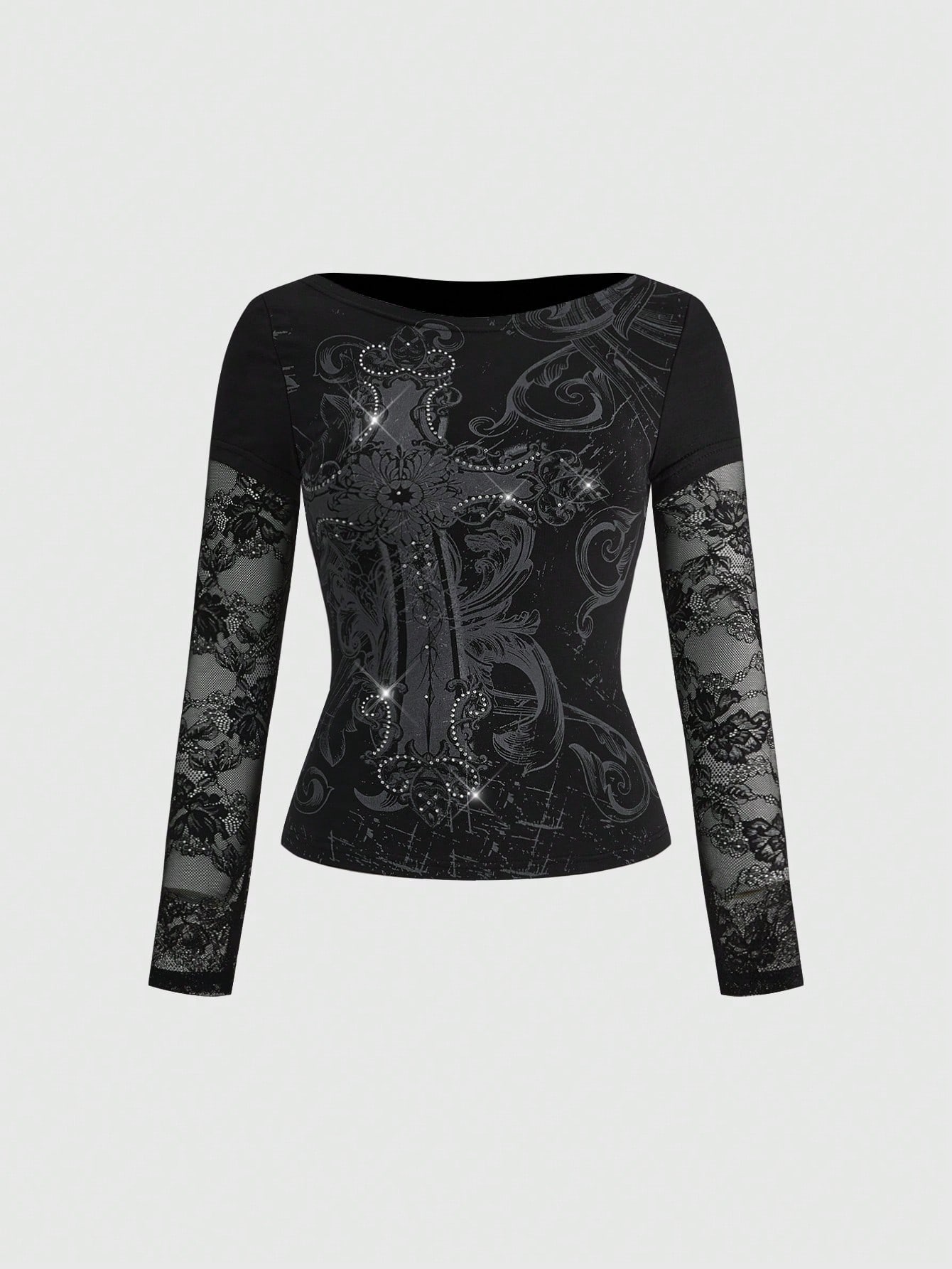 Grunge Punk Women's Y2K Grunge Cross Print Lace Patchwork Long Sleeve T-Shirt