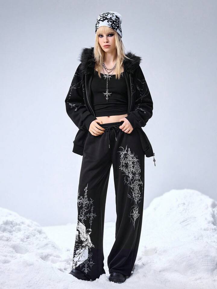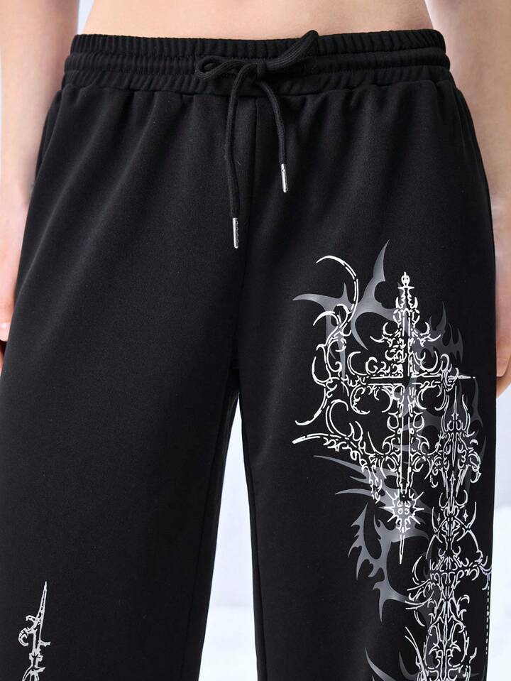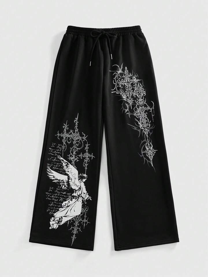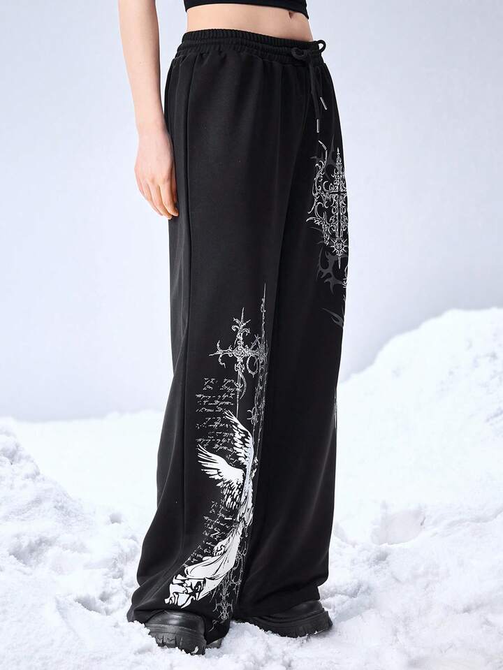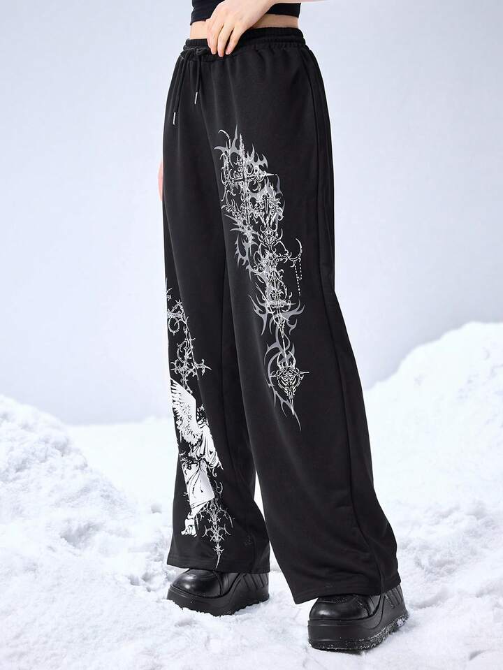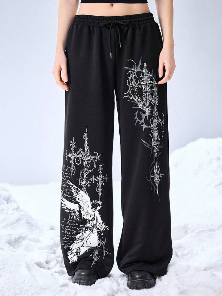 Grunge Punk Y2K Cyber Symbol & Angel Print Loose Women Sweatpants