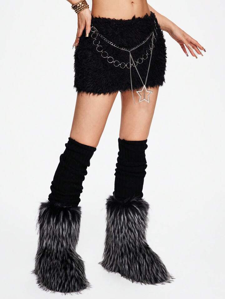 Grunge Punk Y2K Gyaru Gothic Fuzzy Belt Decor Low Waist Skirt For Women, Autumn/Winter