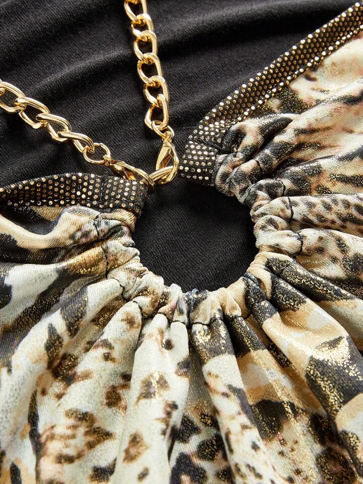 Grunge Punk Y2K Gyaru Style Sexy Leopard Patchwork Cold-Shoulder Fitted Waist T-Shirt With Draped