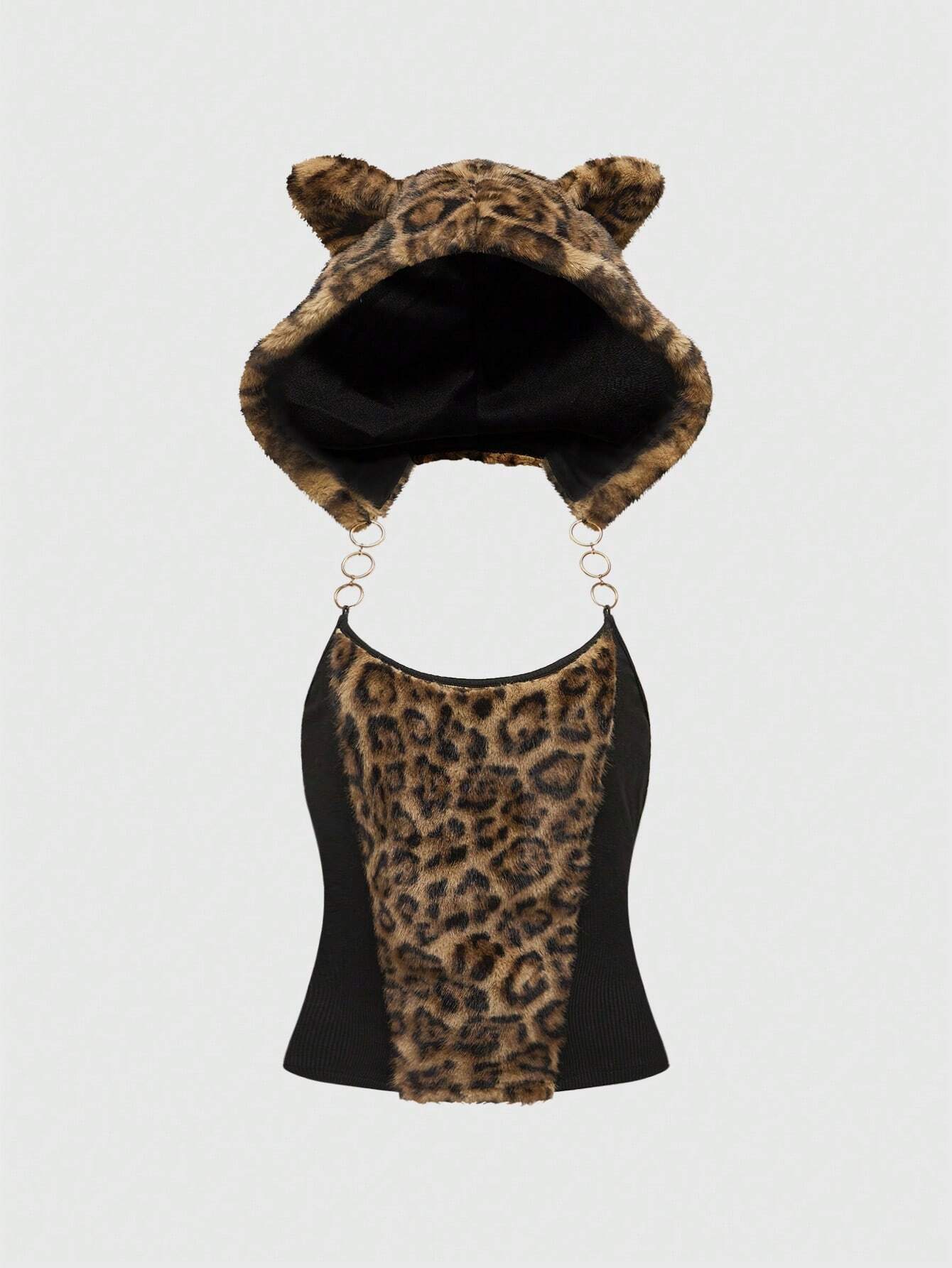 Grunge Punk Y2K Harajuku Gyaru Style Patchwork Leopard Print Fuzzy Cat Ear Hooded Bodycon Tank Top For Women
