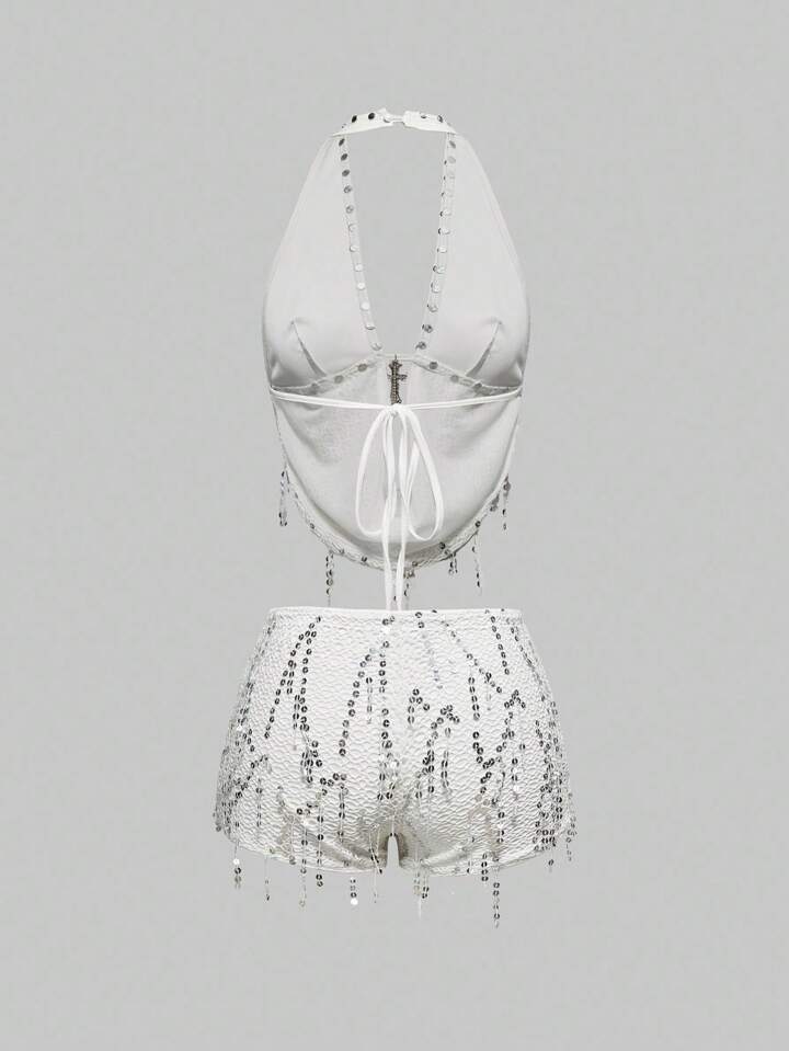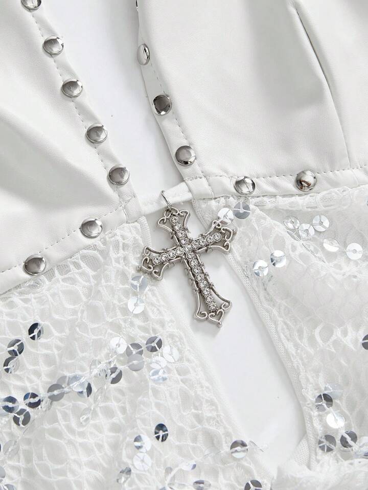 Grunge Punk Y2K Hot Girl Music Festival Outfit Metal Cross Pendant PU Splice Fishnet Sequins Halter Backless Women Suit