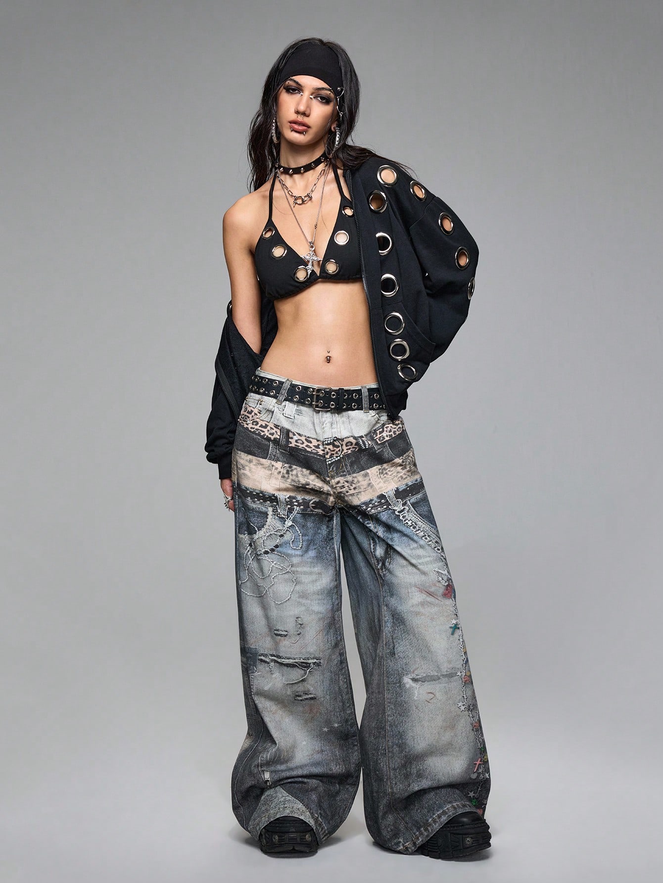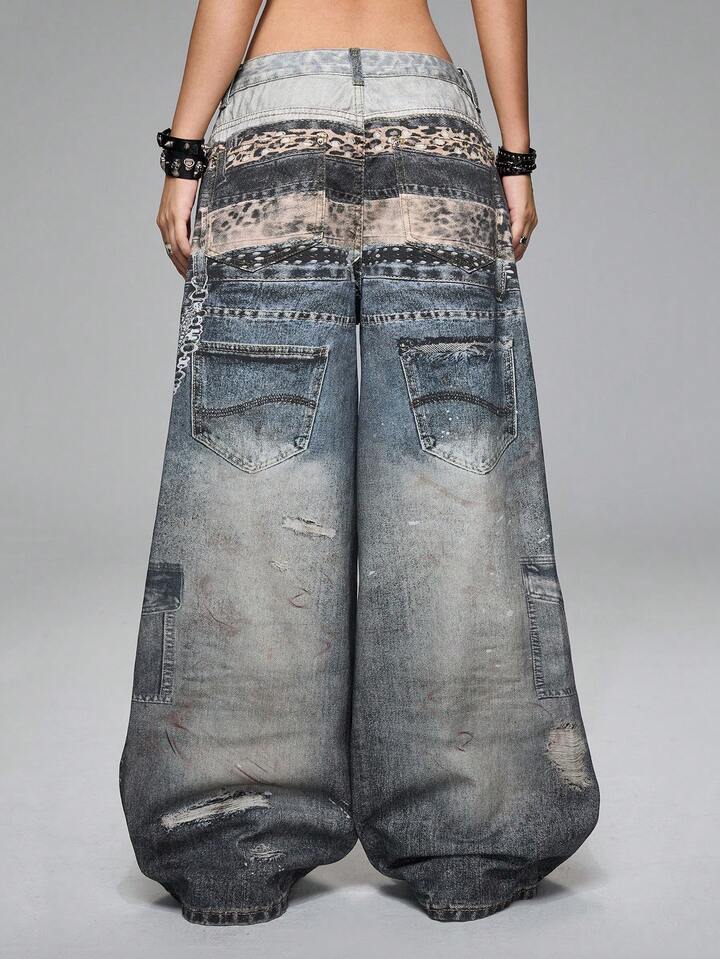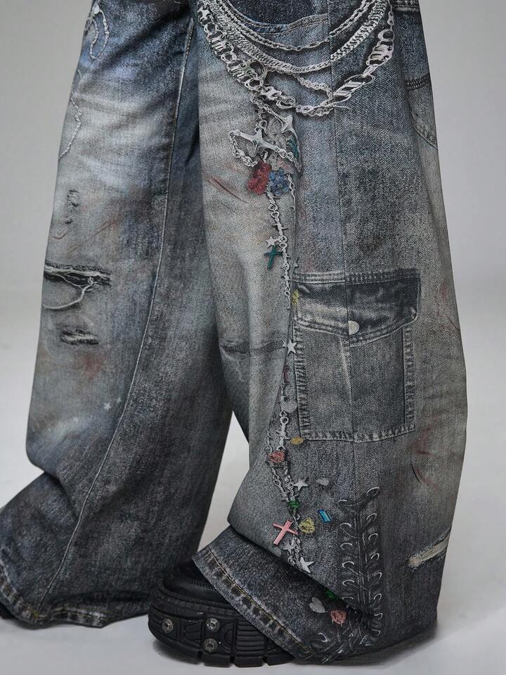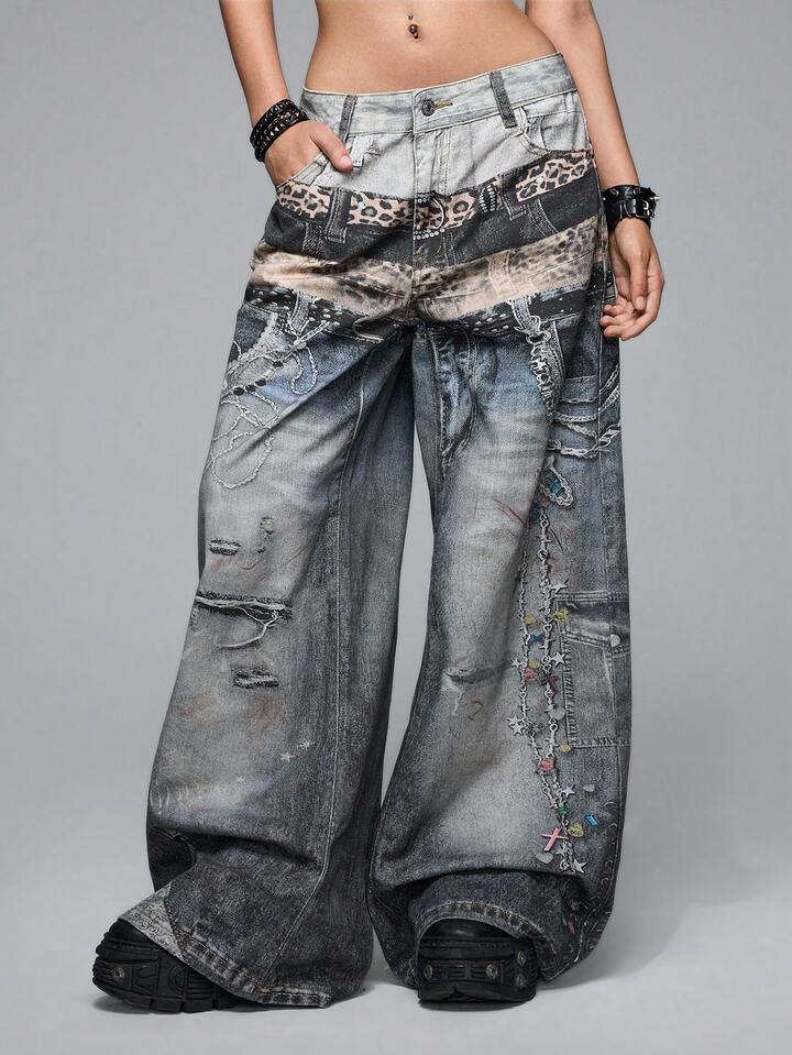 Grunge Punk Y2K Punk Kpop Street Distressed Tie-Dye Multi-Waistband Allover Print Loose Wide-Leg Low Waist Jeans