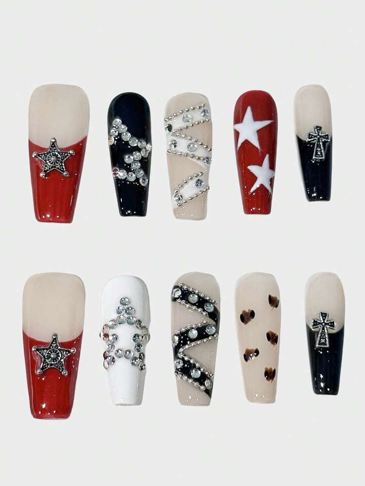 Grunge Punk Y2K Punk Style Handmade Press-On Nails With Western, French, Metallic Star, Cross, 3D Heart Decor In Black & Red, Suitable For Street Fashion Photography