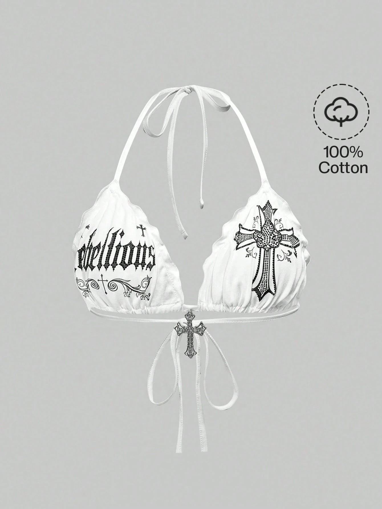 Grunge Punk Y2K Sexy Gothic Cross Print Rhinestone Embellished Plus Size Bikini Camisole